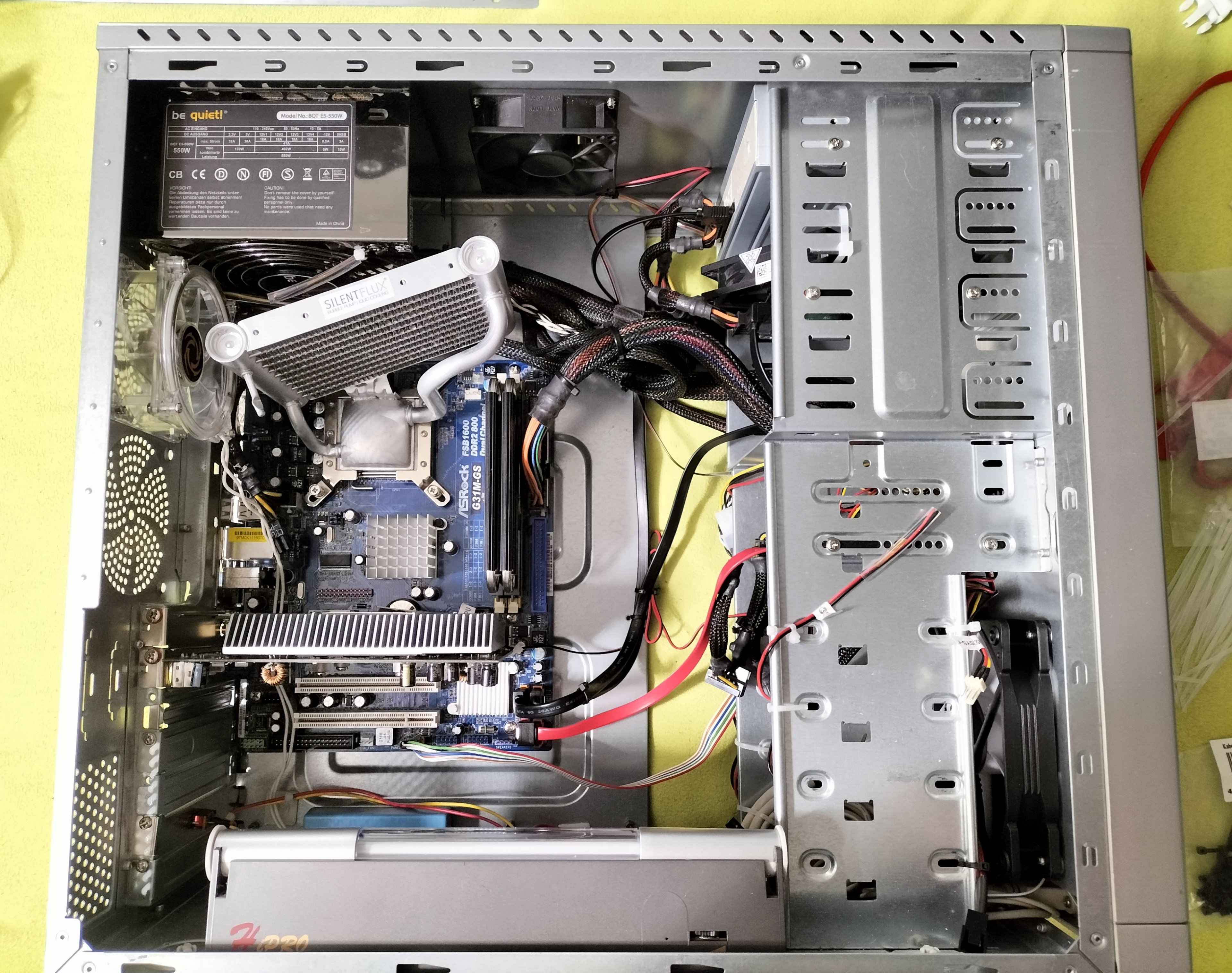 Wenn ich den 80er Lüfter im Heck noch abklemme, dürfte das ganze richtig angenehm leise sein. Der dreht leider mit 2.000 U/min und weiter drosseln geht nicht. Jedenfalls solange, wie ich die Drehzahl auslesen will. Edit: und, die Drehzahlüberwachung piept natürlich, wenn der abgeklemmt ist, weil er an CPU hängt. Anderer Lüfter geht nicht, weil die Drehzahl mit 1.000 U/min dem Teil zu gering ist.