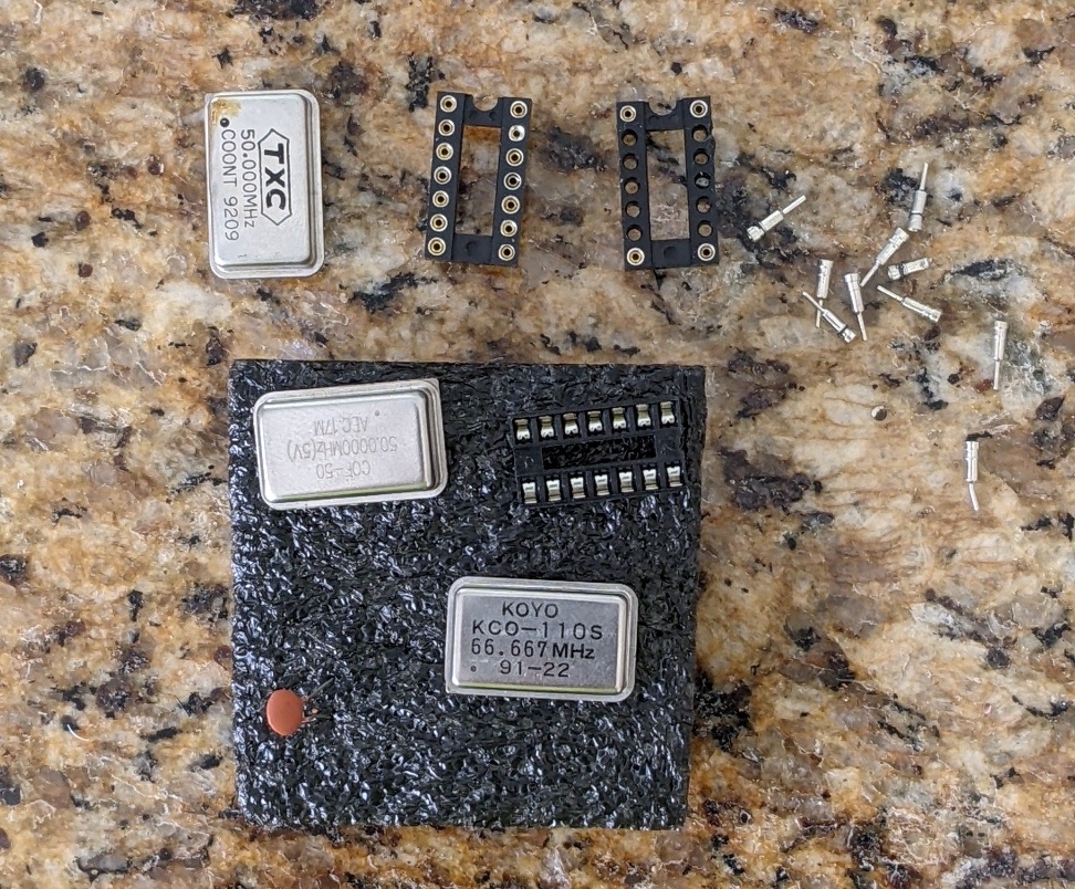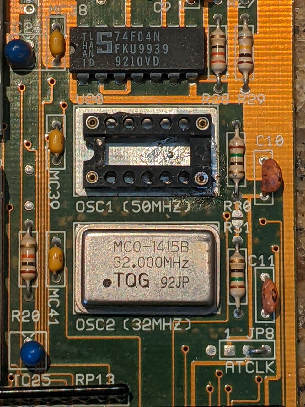 Habe noch etwas Zeit mit dem 386SX-25 verbracht und Chips zwischen den beiden Brettern (dem neuen Intel 386SX-16@20) hin und her getauscht. Es gab nur einen kurzen Moment, wo es Zuckungen zeigte und dann wieder komplett tot war. Da der 50MHz Quartz leicht eingedrückt ist, habe ich mit dem Oszi geschaut und jepp, kein CPU Takt. Klopfen half auch nicht...