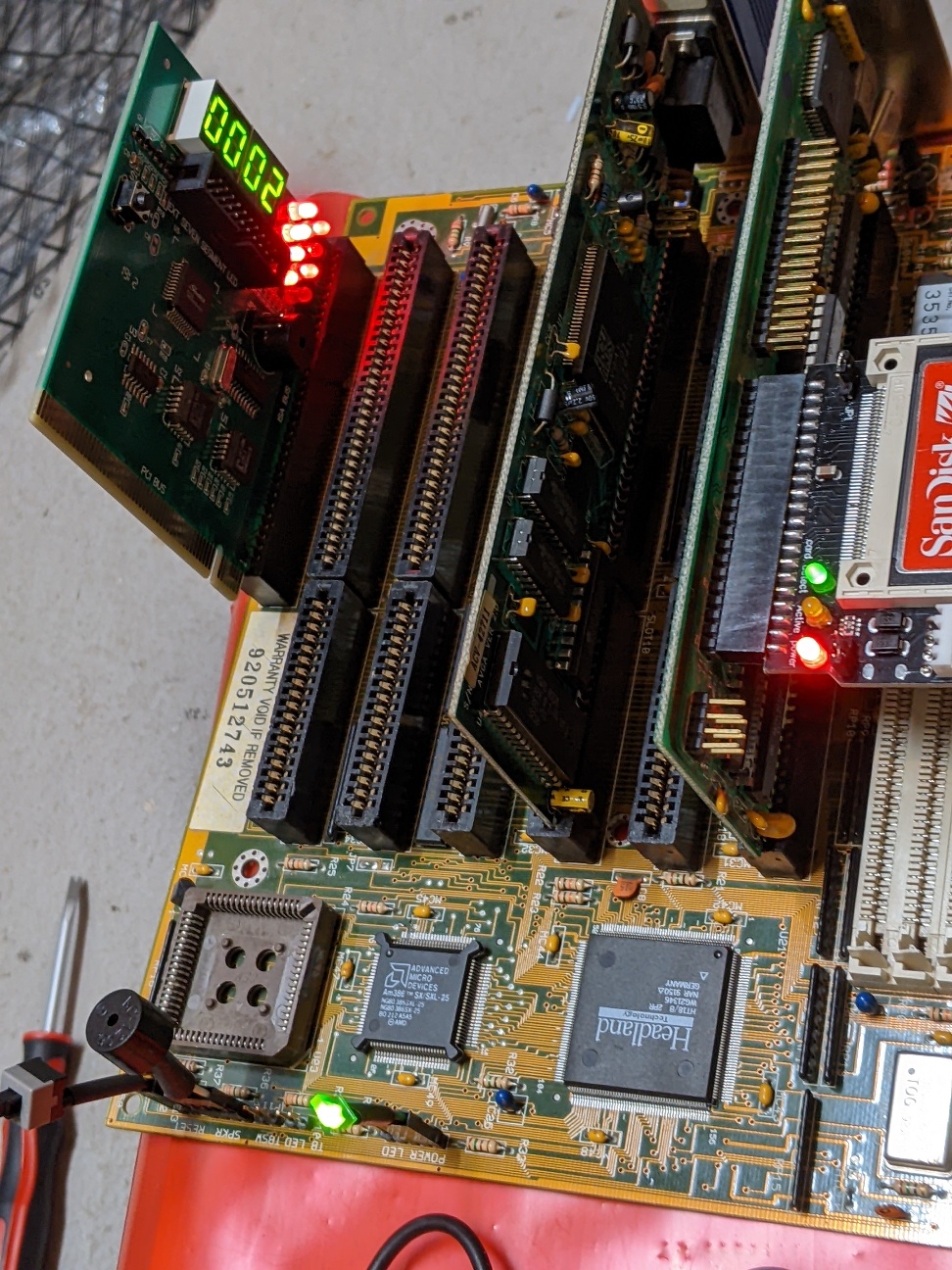 Erster Test ohne Quartz - keine Flammen und logischerweise kein lebendes Board. Habe dann einen 40MHz Quartz genommen und damit zeigte das Brett den bekannten Fehler, dass irgendwelche Daten nicht ausgepackt werden konnten. Ich vermute, dass beim POST Daten in den BIOS Roms gelesen und dort entpackt werden.