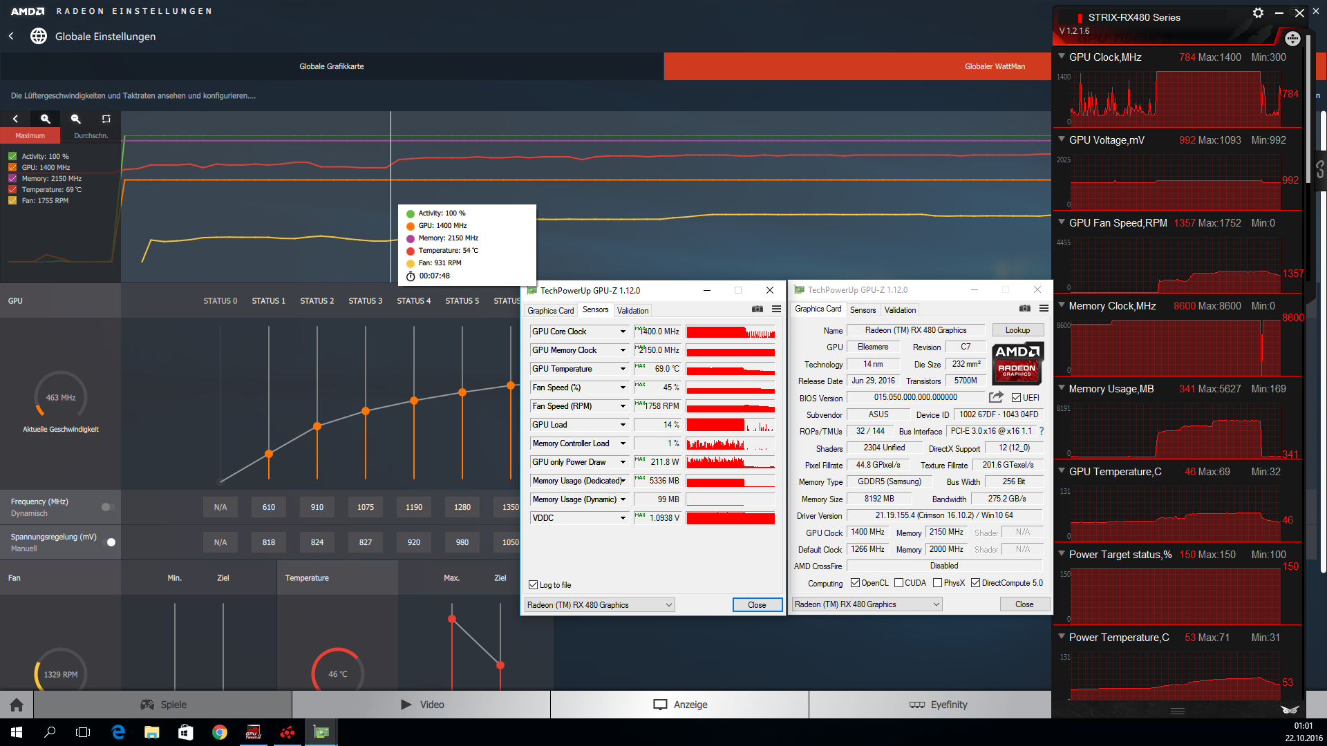 1400 MHz bei einer eingestellten Spannung von 1100 mv und einem Speichertakt von 2150 MHz gekommen.
