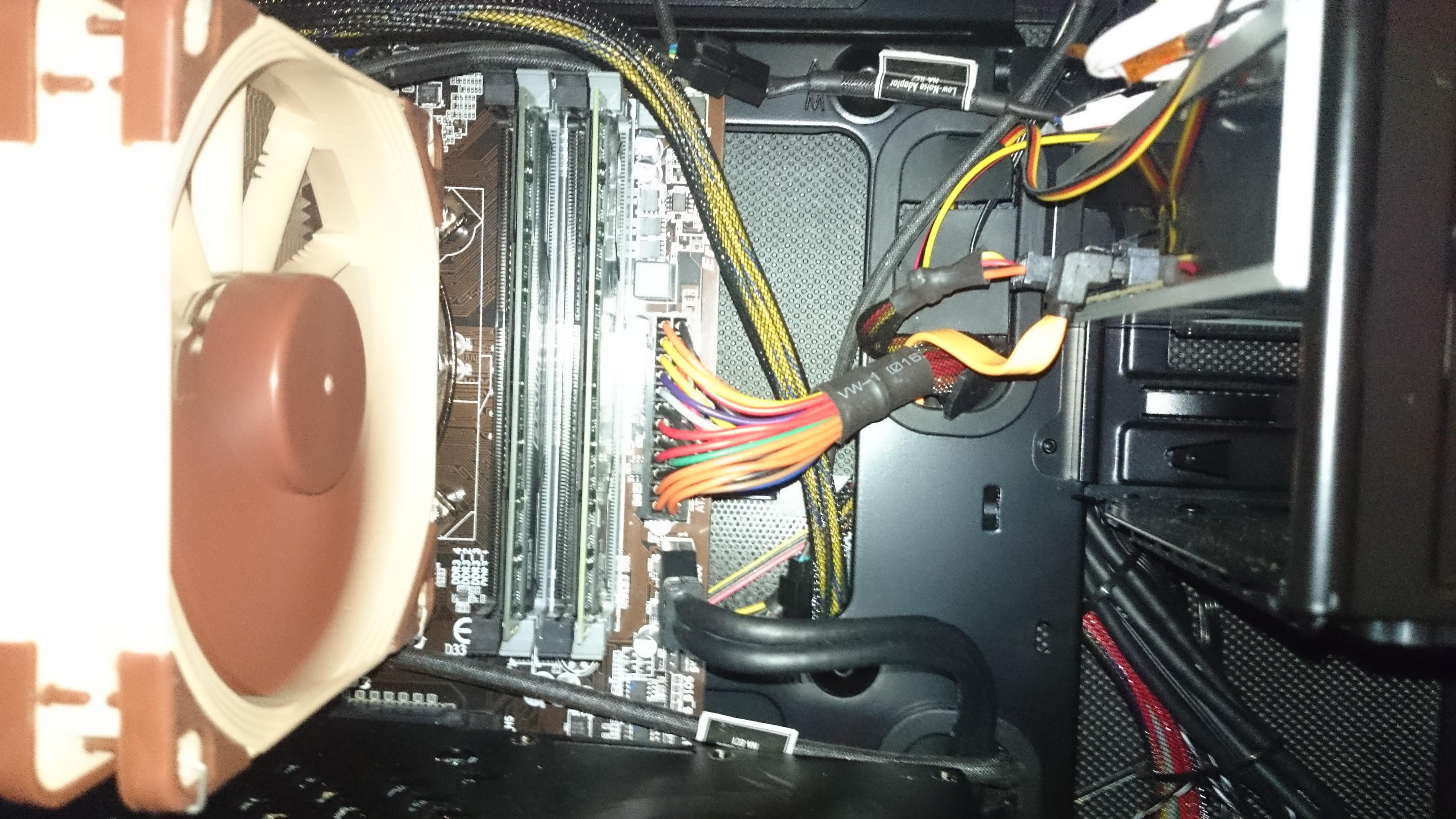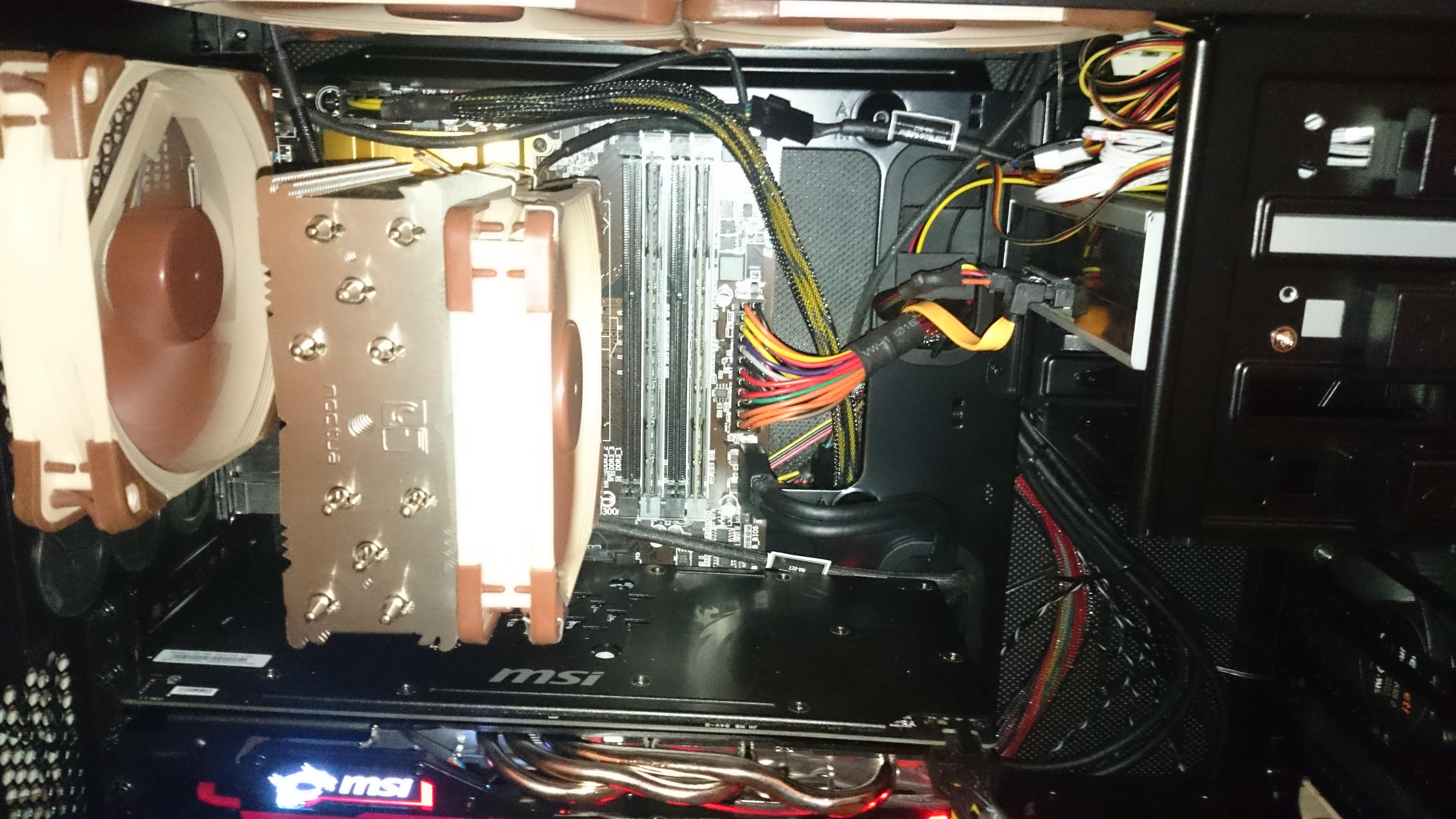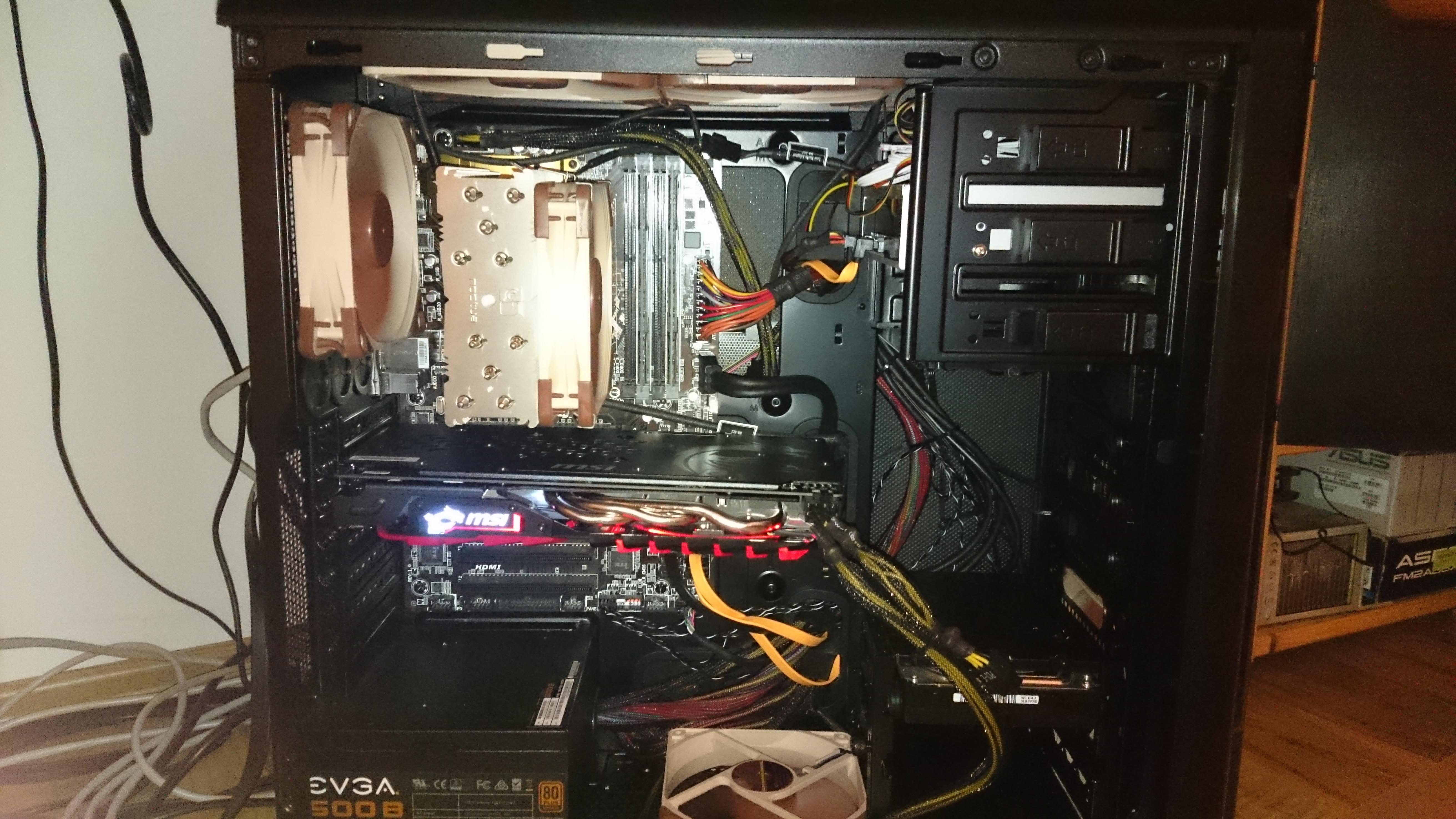 Der Lüfter im Deckel wird von dem CPU Kühler komplett verdeckt, der in meinen Augen (wie @Extrem auch schon sagte) viel zu groß für das Gehäuse ist.
