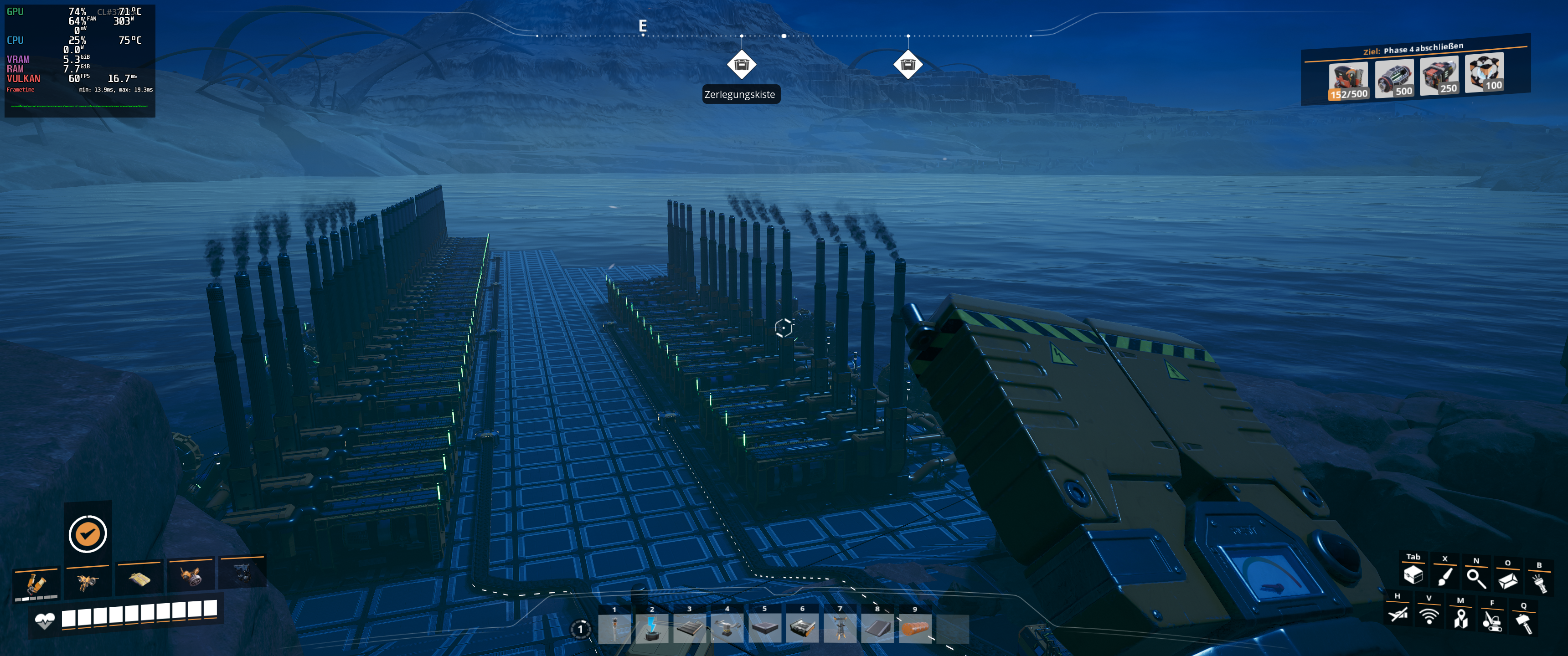 Ein Oelextraktor auf Pure Deposit, voll uebertaktet, also 600 m2 Rohoel. Vielleicht 4 Meter hoeher, also bequem im Headlift Limit, die Plattform fuer die Raffinerien. Immer zwei gegenueber, so das die Pipelineinputs gegenueber stehen.
