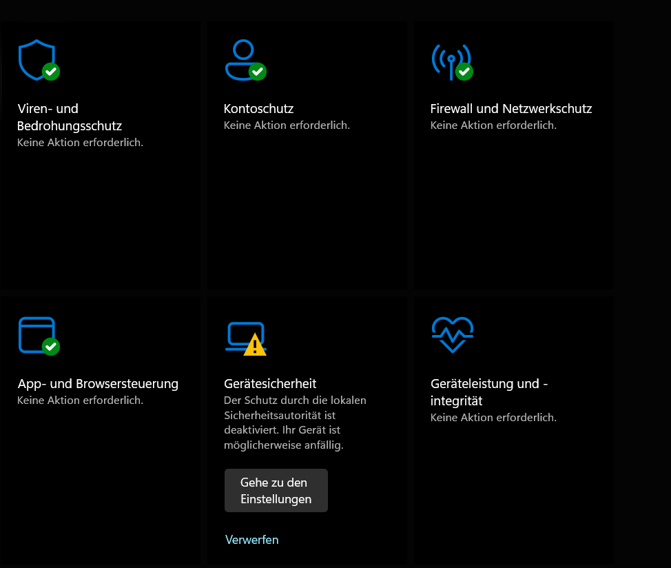 Nach den nächsten Neustart ist der Defender dann abgestürzt und hat in der Taskleiste dauerhaft ein gelbes Warnsymbol gezeigt.