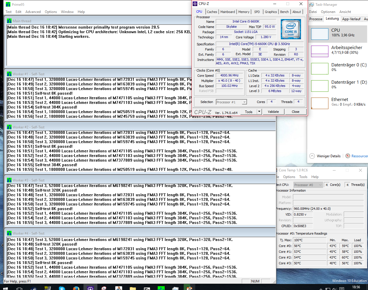 Nun der Test mit Prime95 lief nicht so gut.. Die Temperatur nach 4 Minuten aller Cores betrug 97-100°C deswegen Test sofort abgebrochen.
