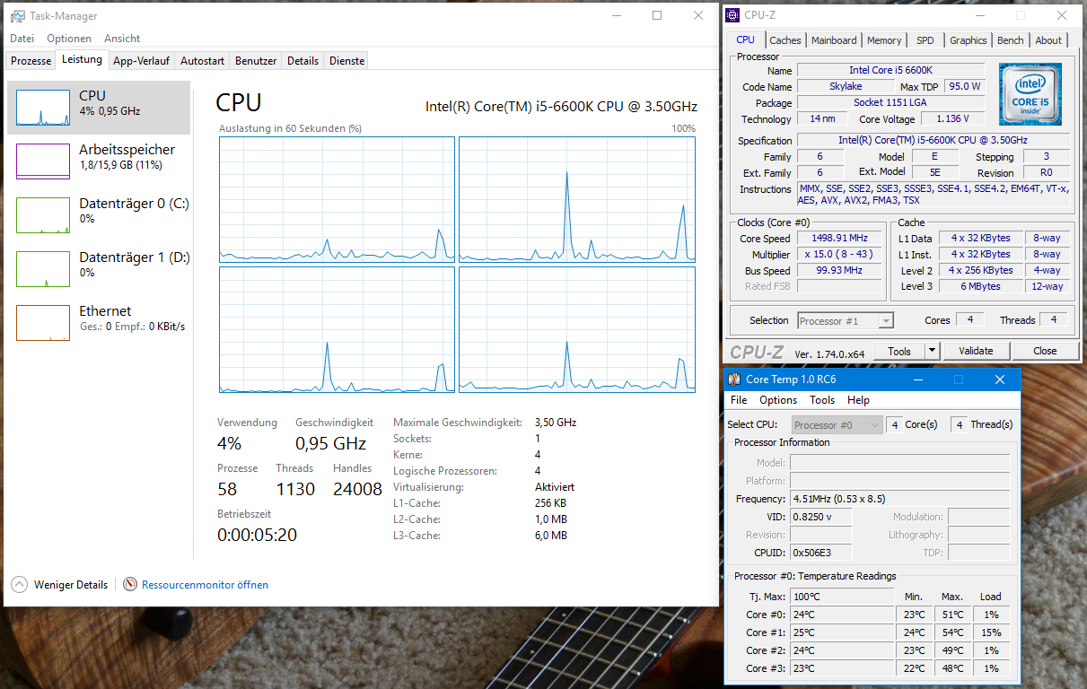 Geh mal in die Energie Optionen von Windows, falls der Spass auf Höchstleistung steht, stellst es mal auf Ausbalanciert. Überprüfe auch mal, unter den erweiterten Energiespareinstellungen, ob der "Minimale Leistungszustand" des Prozessors auf 5% steht.