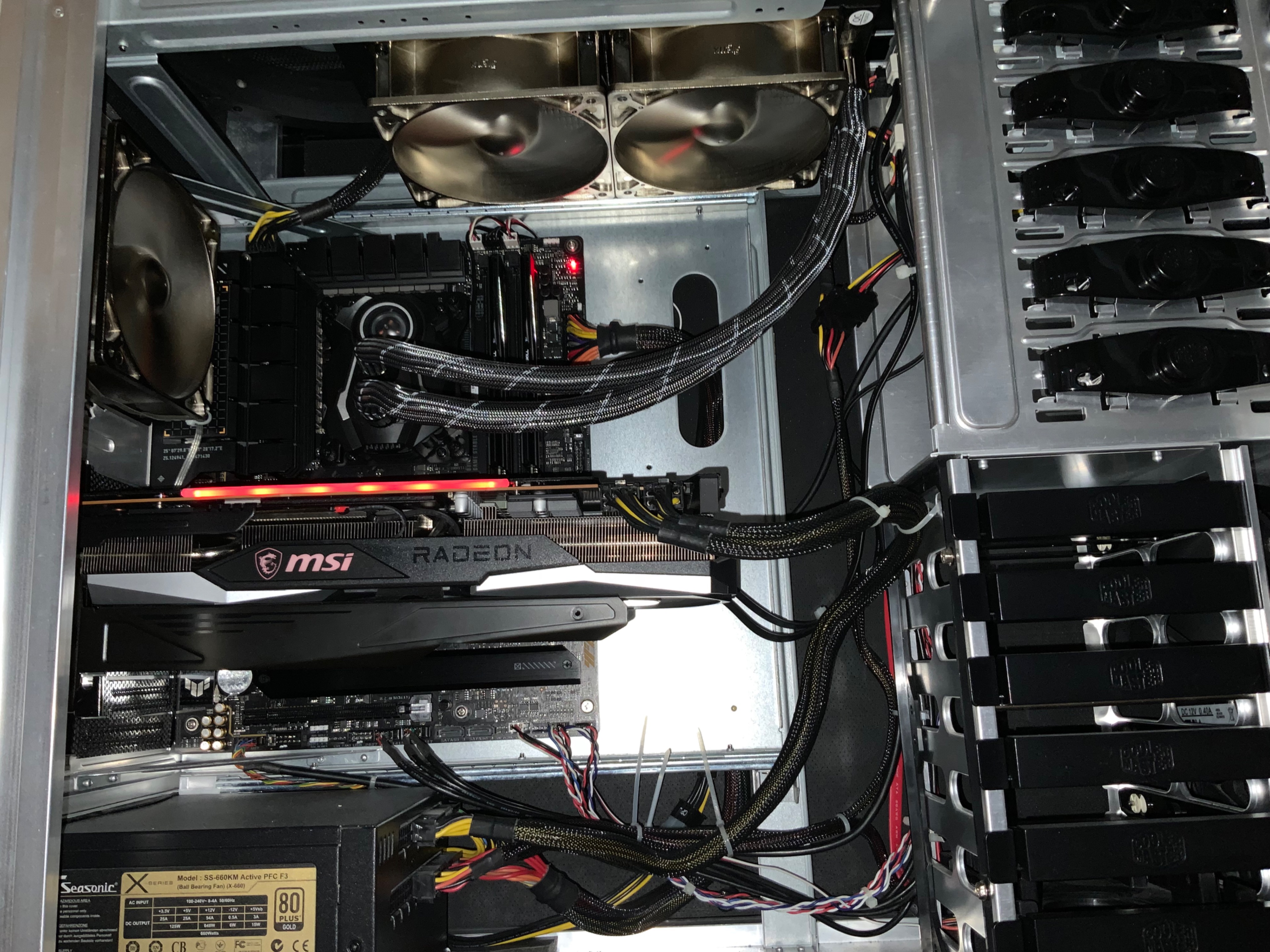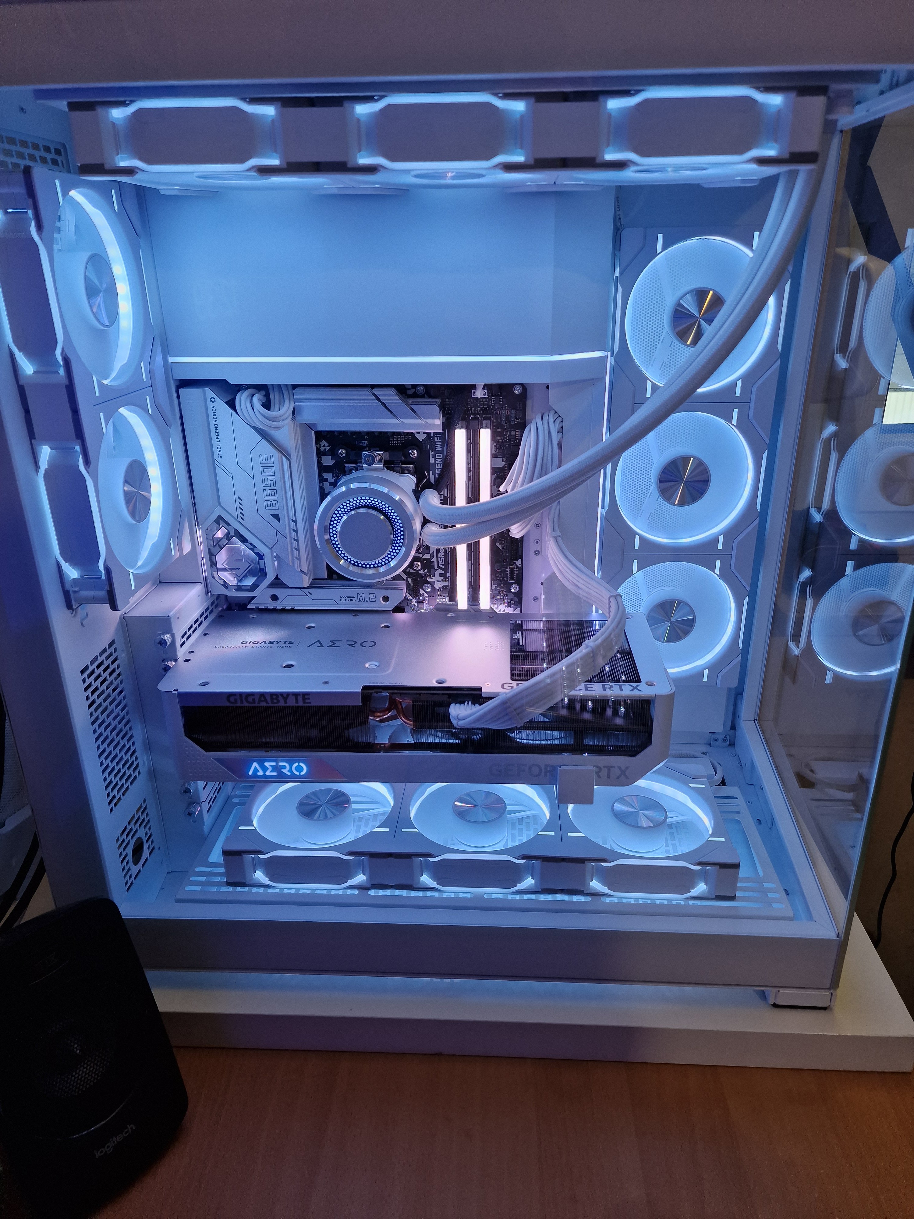 Seit 2012 habe ich mein geliebtes Cooler Master ATCS 840 in Schwarz…..Schwarzes Aluminium voll gedämmt und 3x230mm Lüfter auch sehr Leise bei guter Durchlüftung. Die Aio für die CPU ist auch sehr Leise durch meine 120x38mm dicken Lüfter. Der Durchsatz ist Top bei 1000/Umin und nicht Hörbar. Was ich an dem Gehäuse liebe ist die Größe. Bis jetzt gab es noch keine Hardware die nicht gepasst hätte. Insgesamt mag es es Aufgeräumt. Kabel verlege ich möglichst Clean. Das einzige was ich mir Februar 2025 bei dem Aufbau unser neuen Büromöbel gegönnt habe, ist ein LED Band unter der Tischplatte die Abends beim Gaming die gewisse Atmosphärische Lichtstimmung erzeugt.