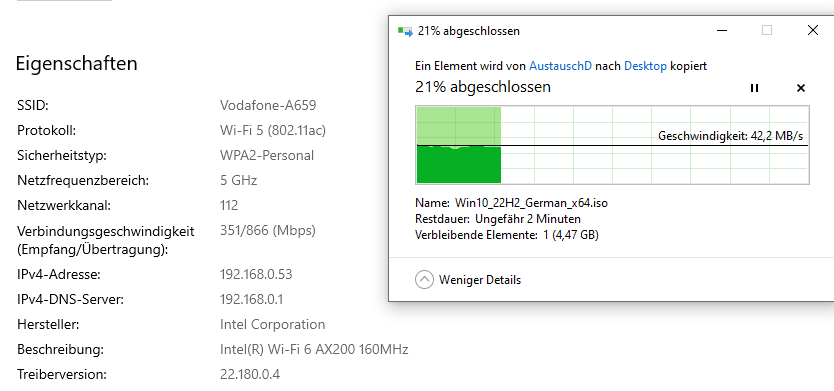 Obwohl der Router quasi direkt hinter der Wand in max. 1m Entfernung steht, habe ich mit dem WLAN im Schnitt nur ca. 20MB/s - stark schwankend zwischen etwa 8MB/s und knapp 40MB/s.