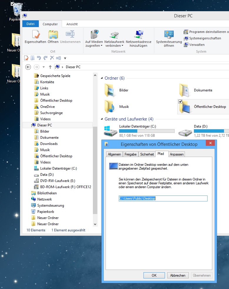 Der Ordner "Desktop" hat sich allerdings anders verhalten. Zuerst konnte ich den Pfad ändern und editieren, nach dem Ändern jedoch nicht mehr. Ich habe es von "C:\Benutzer\Brunno\Desktop" auf "C:\Users\Public\Desktop" und kann es nicht Rückgängig machen. Auch ist der Ordner Desktop im Verzeichnis "Brunno" nicht mehr vorhanden (S. Bild).