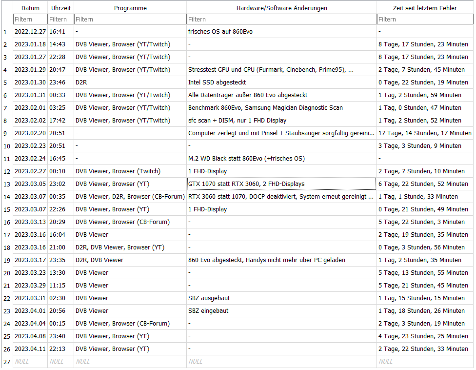 Nicht mit dem Problem in Verbindung zu bringen sind vereinzelte Fehlereinträge vom Nvidia Treiber (zuletzt einmal heute Nacht um 4 Uhr und davor am 29.01. Mittags) oder z.B. MDM (zuletzt heute um 16 Uhr, davor am 28.12.)