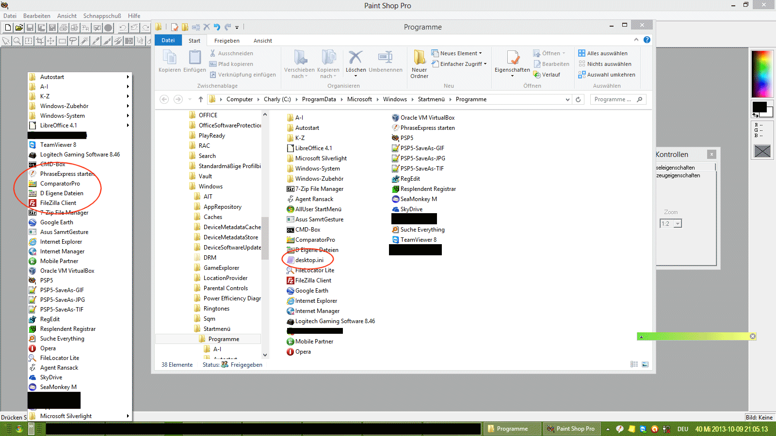 OK. Das macht ja irgendwie Sinn. Und auch nicht. Die Datei, real auch im Desktop des Benutzerprofils existent, ist laut ihrer Eigenschaften «versteckt» (für DOS: A, S, H). Das ist (Verstecktes bei mir latürnich stets sichtbar) irgendwie normal. Nur ist es für mich völlig neu, dass ich diese vermaledeite Datei auf dem Desktop sehe! In einem Hilfs-Startmenü das auf die Startmenü-Ordner verweist gibs auch Desktop.Inis, nur sind die eben da ordnungsgemäß unsichtbar!