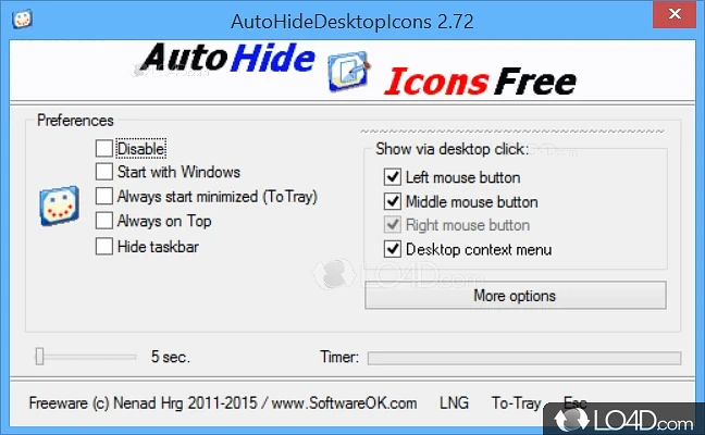 Dafür nutze ich seit Jahren das kleine Praktische Tool, Auto Hide Desktop Icons was wie viele andere Programme über den Auto Start läuft.