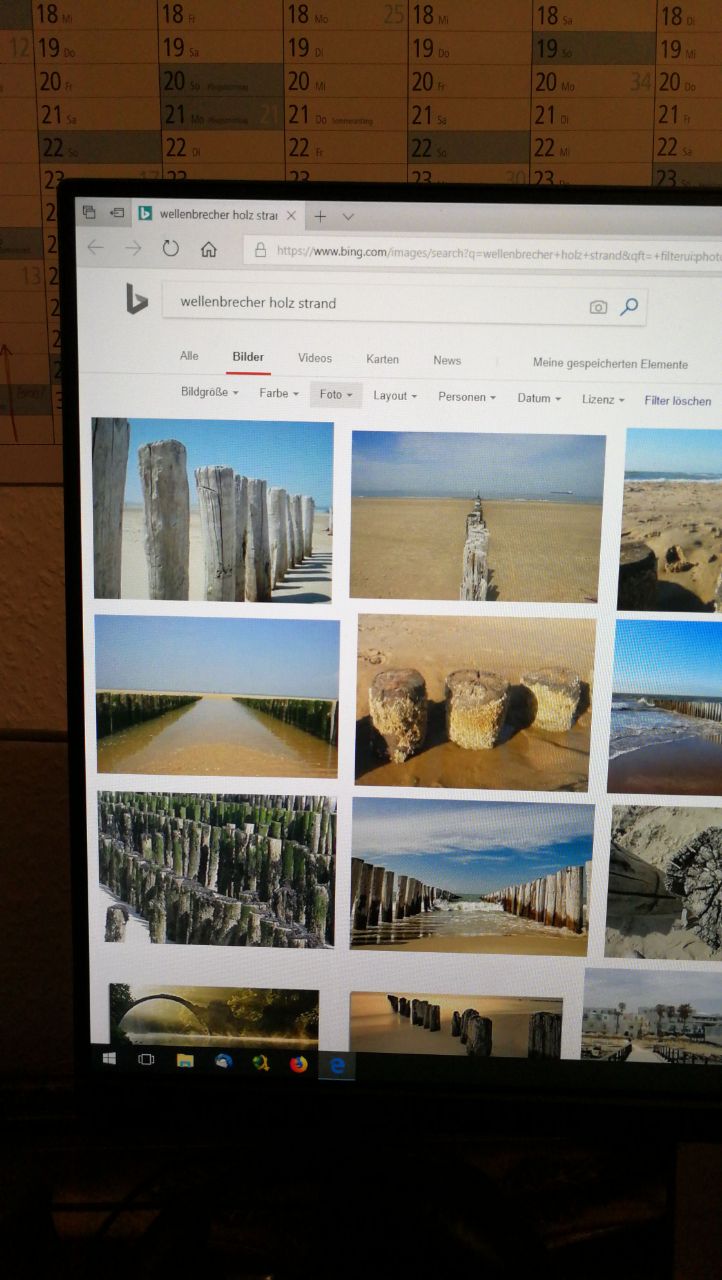 Der Edge Browser ist offen, über Bing wurde nach "wellenbrecher holz strand" gesucht und der Reiter "Bilder" aktiviert.
