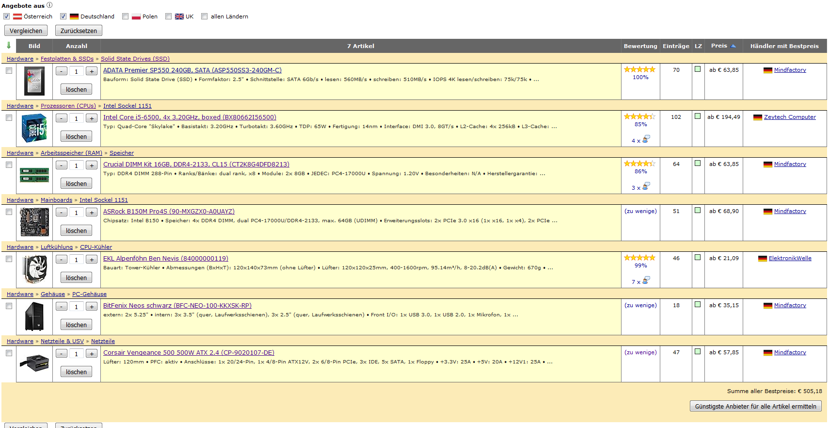 mir wurde hier vor 2 Jahren schonmal geholfen. Da sich in dieser Zeit bestimmt einiges geändert hat, komme ich gerne zurück, um die Zusammenstellung nochmal überprüfen zu lassen. Sie ist für einen Bekannten. Er möchte seine Videos damit bearbeiten. Spiele hat er WoT und einige ältere Shooter am Start. Was er in Zukunft unbedingt zockken muss, weiß er jetzt noch nicht. Ich hoffe , ich habe ihm eine relativ preiswerte Kiste zusammengestellt, nach Belesung und der Nutzung des Leitfadens hier im Forum. Falls ihr Alternativen habt, wenn es preiswert und gut ist, immer her damit. Bei der GraKa bin ich im Moment überfordert, deshalb hab ich sie erstmal weggelassen und hoffe auf Beratung. Ein Betriebssytem braucht er auch noch. Win 7 Pro oder gleich 10? Wo bekommt man dies günstig her. Sind die Angebote in der Bucht legal?