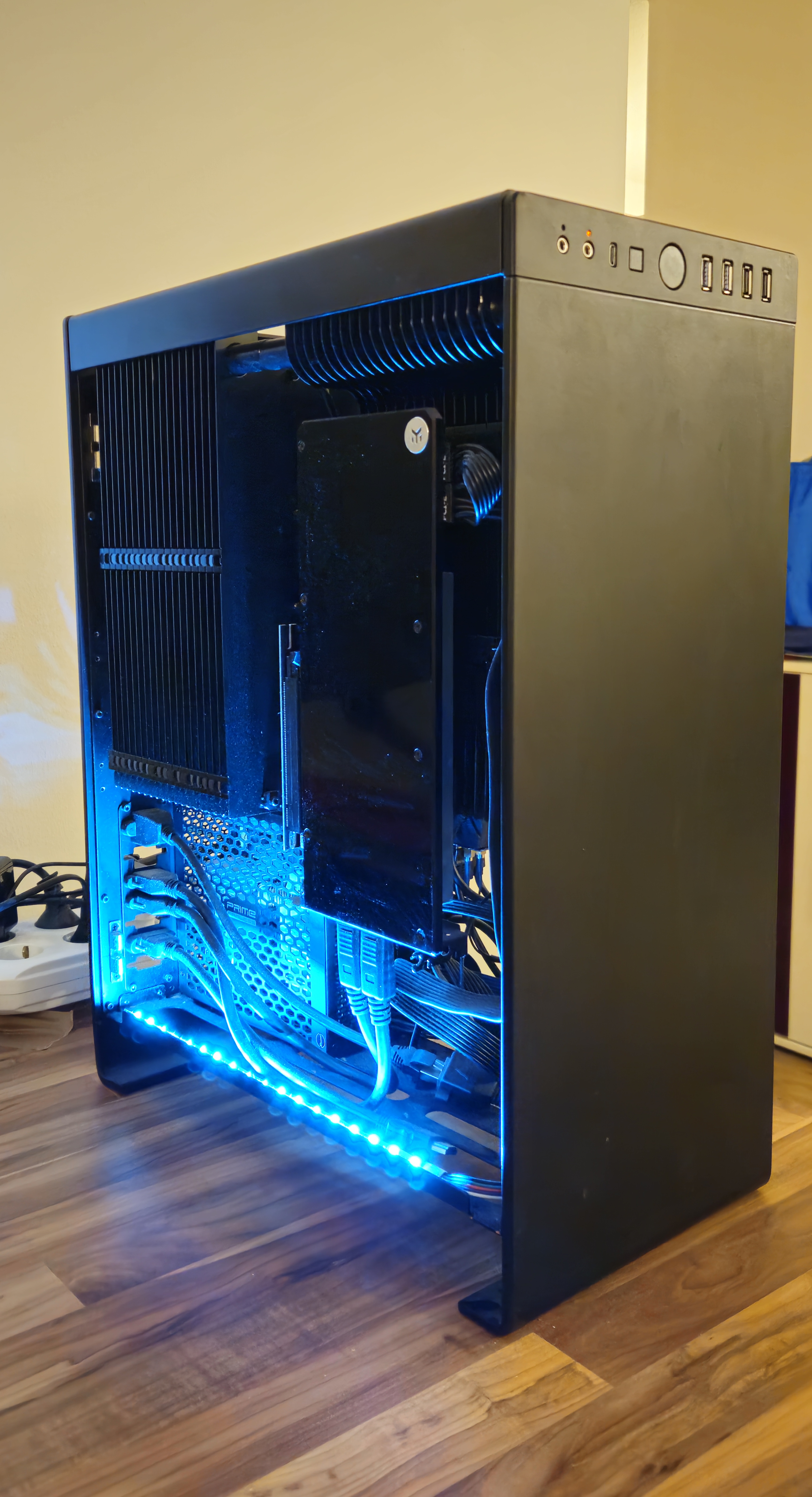 Mir fällt da gerade auf, dass der RGB Blauton der (auf blaue Beleuchtung umgestellten) Powercolor Red Devil nicht ganz den etwas helleren vom Gehäuse trifft, aber nun gut, so tragisch finde ich das auch nicht, zumal das für mich sowieso eher nebensächlich ist.