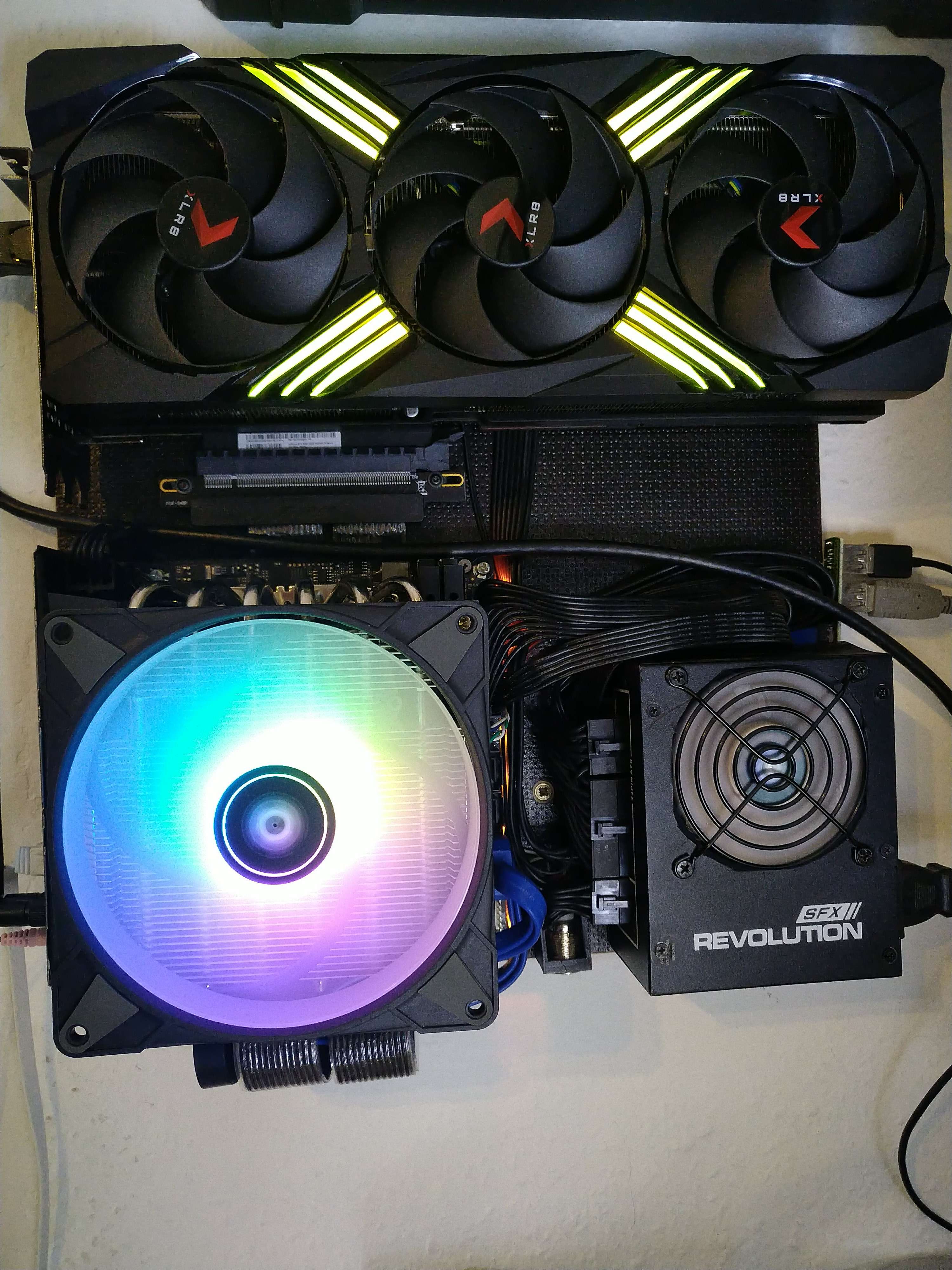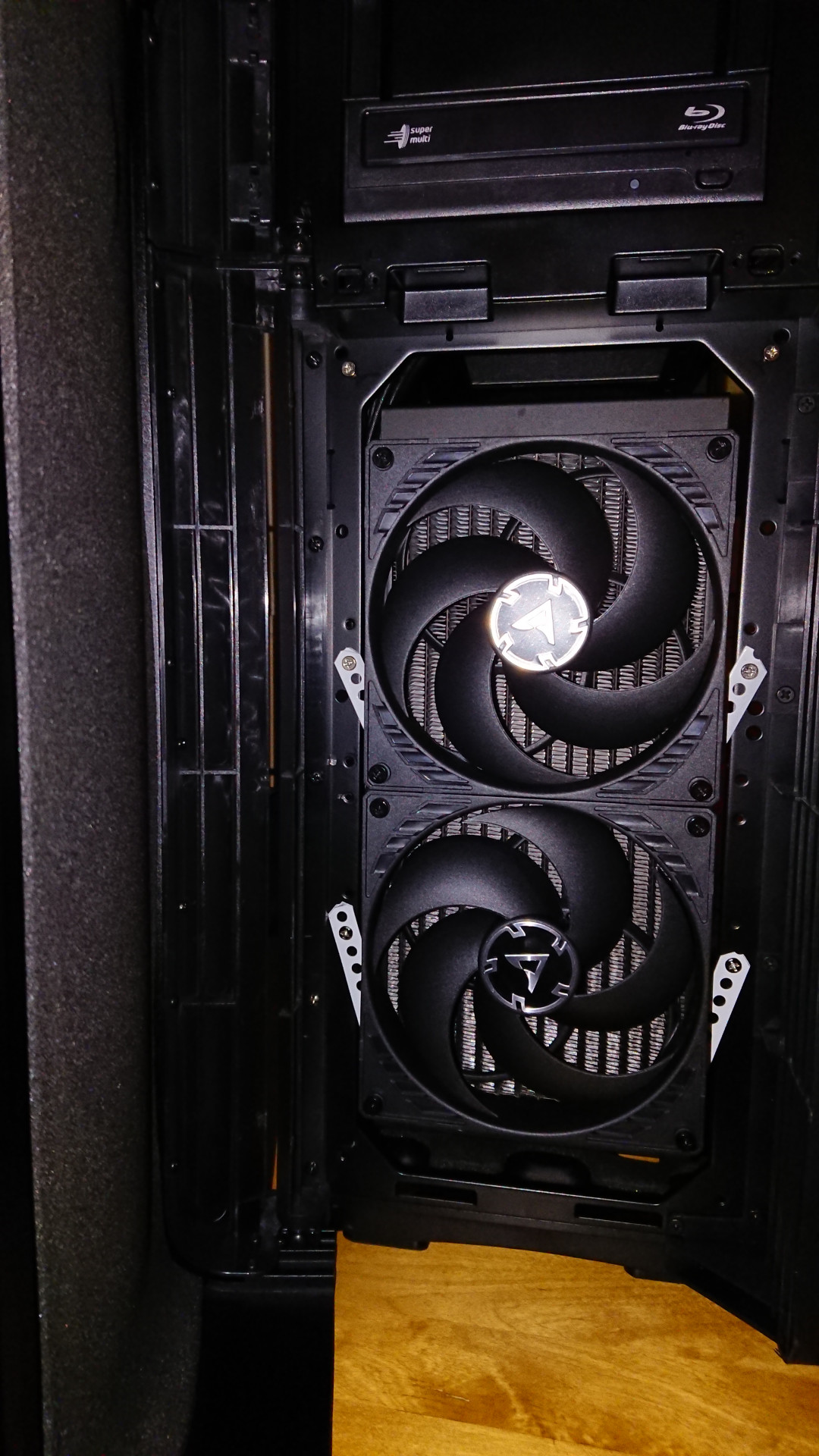 Einzig für den Radiator mußte ich mir mit Lochband ausm Baumarkt behelfen, weil die Adapter-Halterungen leider nur auf 360er Radis ausgelegt und deshalb die Schraublöcher auf der falschen Höhe sind. AiO ist die LiquidFreezer 280mm.