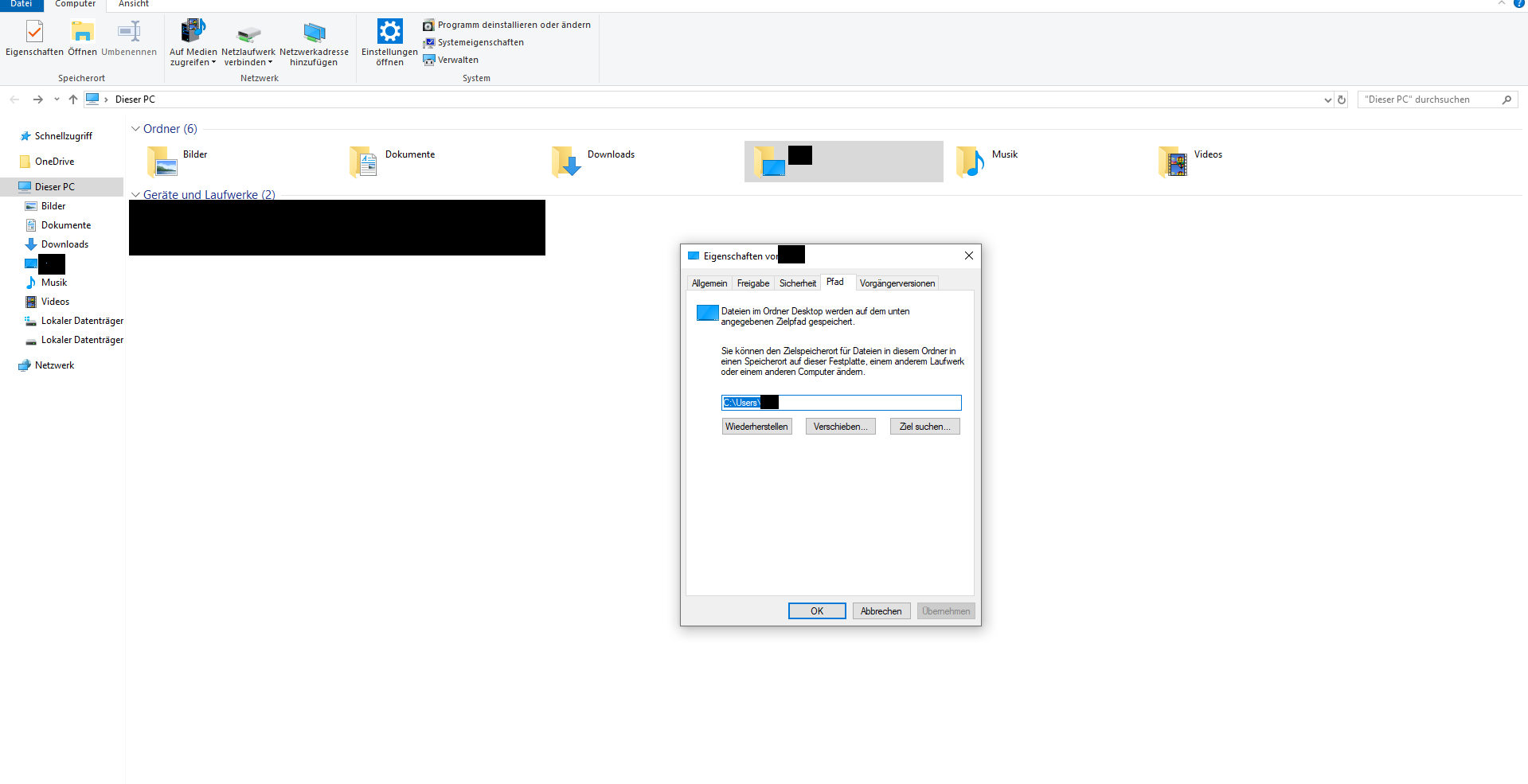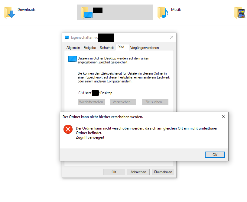 Das heißt, wenn ich versuche den Desktoppfad von C:\Users\XXXXXXXX auf C:\Users\XXXXXX\Desktop abzuändern kommt die Meldung, aber auch wenn ich einen Zwischenschritt auf einer anderen Festplatte versuche.