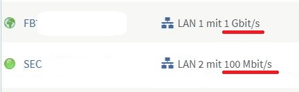 Bender hat dir gezeigt, wo man 1000 oder 100 beim Mac sieht. Im Anhang ein Screenshot, wo du es bei deiner Fritzbox sehen könntest, wenn du sie z.B. per LAN 3 mit dem ONT verbindest. Nochmal die Frage, kommen da 100 oder Gigabit zustande? Dass du in dem Test kein Internet hast, ist egal, es geht um die Teilstrecke.