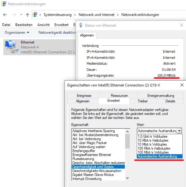 Mit PC meinst du jetzt auch keinen Mac? Als weiterer Anhang, ein Bild von Windows. Im Geräte-Manager zu sehen, dass die Gigabit-Karte automatisch aushandelt, aber wegen eines schlechten Kabels oder Wackelkontakts nur 100 MBit gefahren werden.