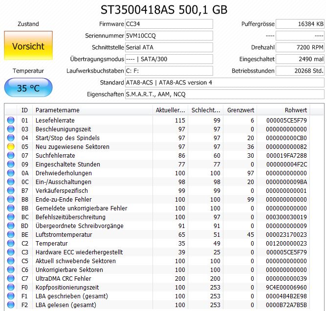 ich habe eine Platte von WD und diese zeigt mir,wie am anhang gesehen, bei C5 und C6 jeweils den rohwert 9 an,was heisst das? durch die unkorriegbare sektoren, kann ich die Festplatte auch nicht suchern, weil dann fehlermeldung kommt, das durch die defekten sektoren keine sicherung erstellt werden kann. kann mir da jemand helfen oder kann ich die festplatte nicht mehr retten? weil es zu spät ist?