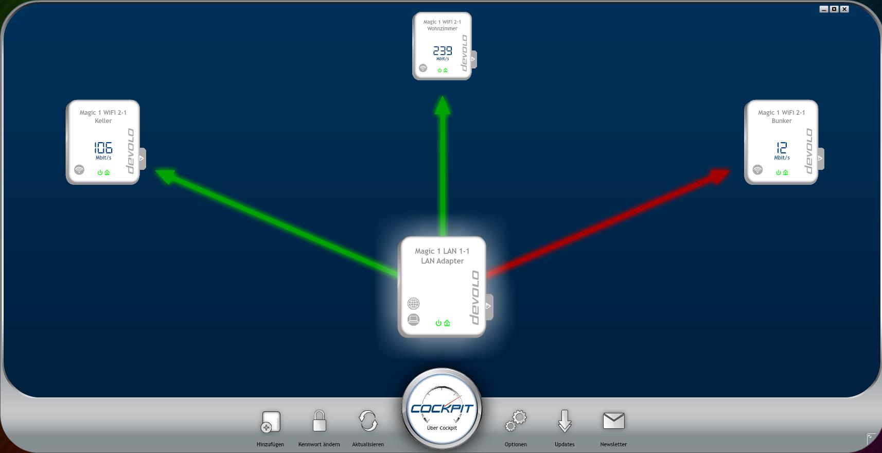 Ich habe 3 W-Lan Adapter und den Lan-Adapter installiert. Alles soweit in Ordnung. Habe den Lan-Adapter im Erdgeschoß mit dem Router verbunden, 1 W-Lan Adapter im Keller einen im 1. Stock und den letzten im 2. Stock installiert. Alle Adapter haben eine eigene Steckdose.