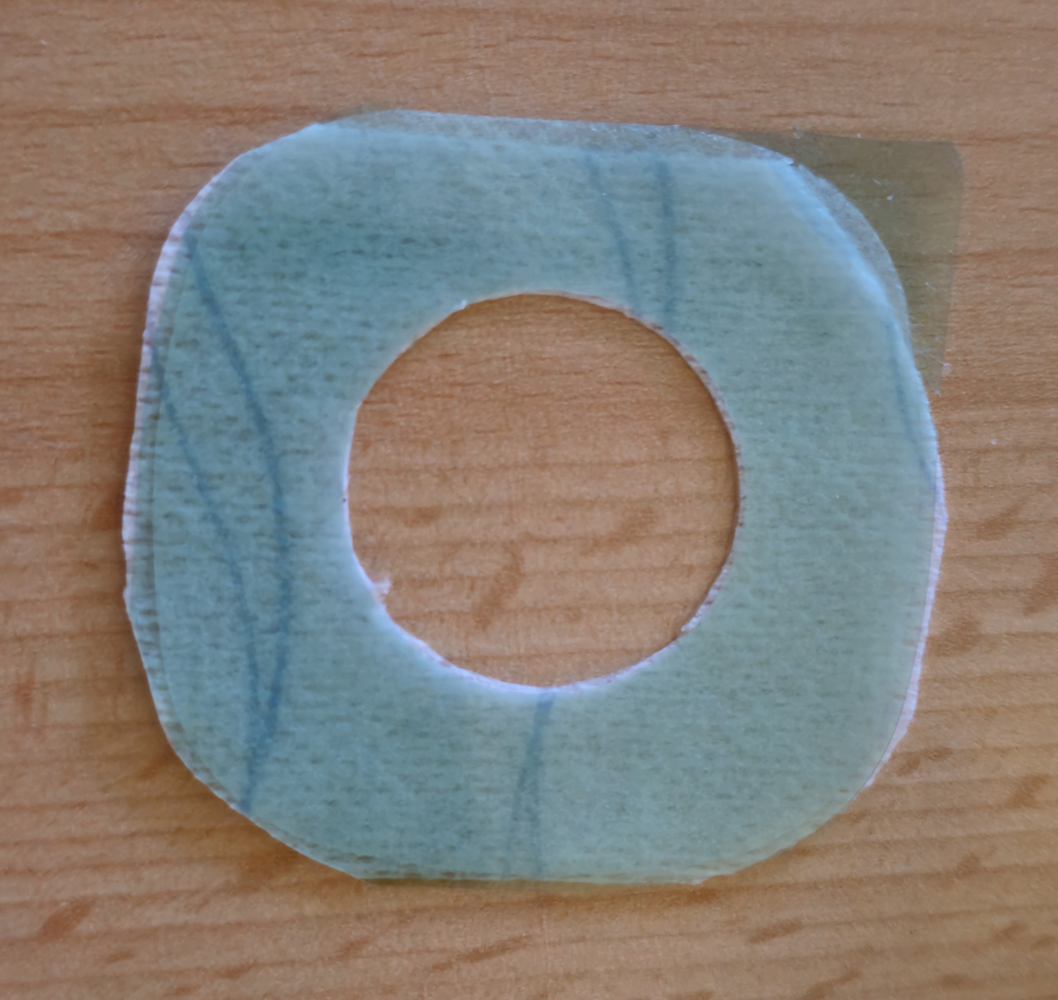 Habe mir hierzu zunächst eine Schablone angefertigt. Daraus schneide ich mir dann einen runden Pflaster. Auf der Rückseite hat das Pflaster eine Klebefolie, die bereits mittig durchtrennt ist und so einfach mit dem Abziehen der Folie ist. Meine Empfehlung ist aber, die Folie selber mit einem Skalpell durchzutrennen, denn was original durchtrennt ist, scheint nicht gut genug zu sein.