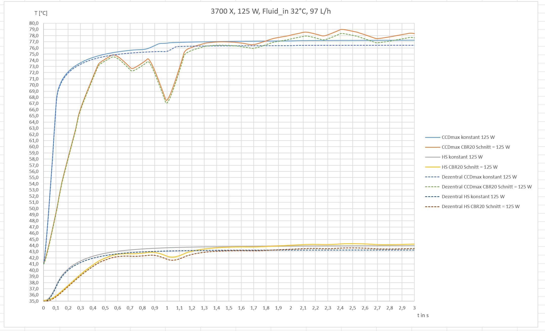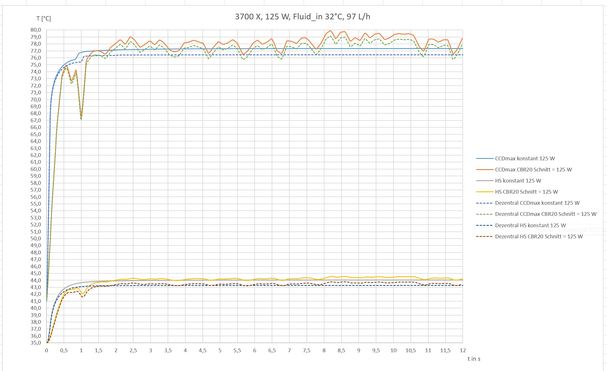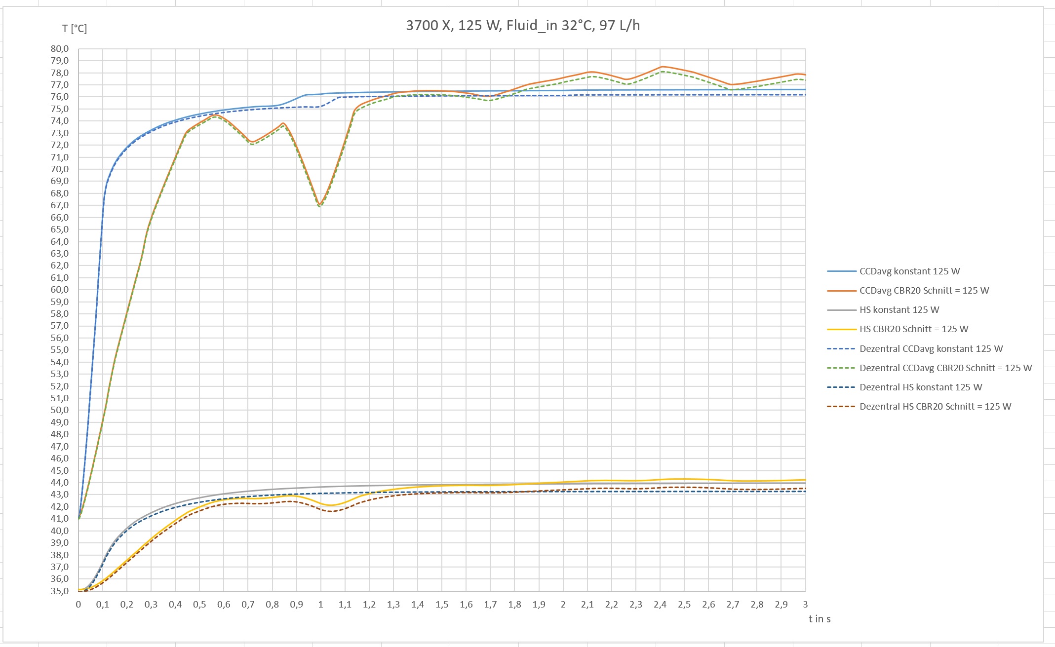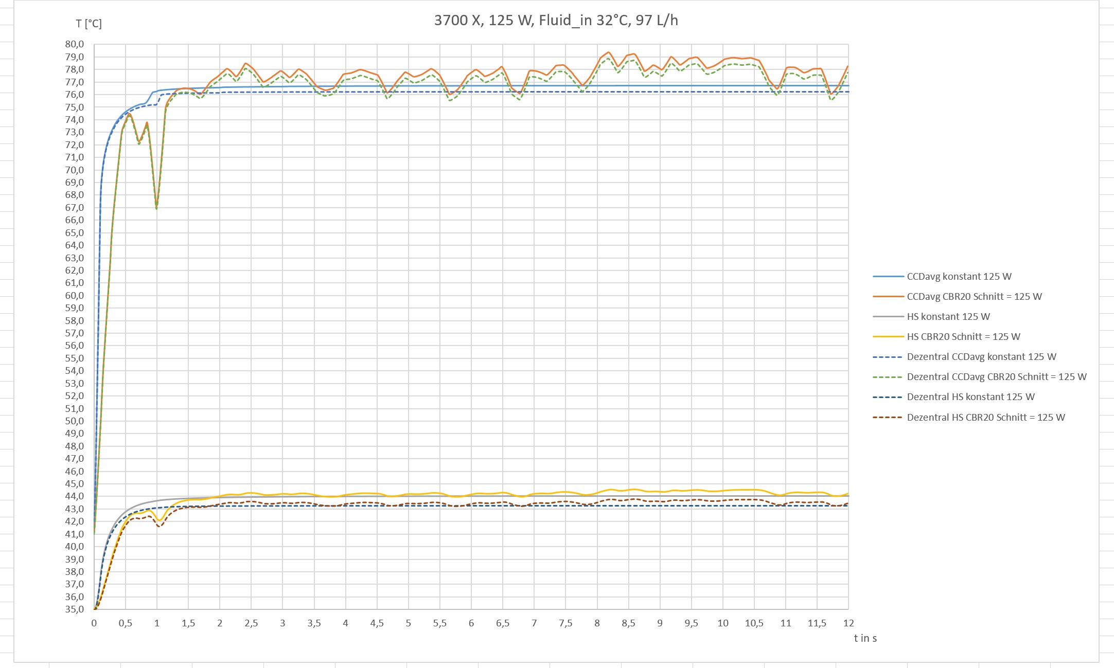 Die Grafik sollte eigentlich selbsterklärend sein. Dezentral steht für eine Verschiebung des Kühlers zum Mittelpunkt der CCD. HS bezieht sich auf die Temperatur zwischen Heatspreader und Kühler. CCDmax auf die maximale CCD Temperatur. Hier gibt es weitere Plots die sich auf CCDavg beziehen. CBR20 steht für einen CB-Lauf mit einer durchschnittlichen Package Power von 125 W.