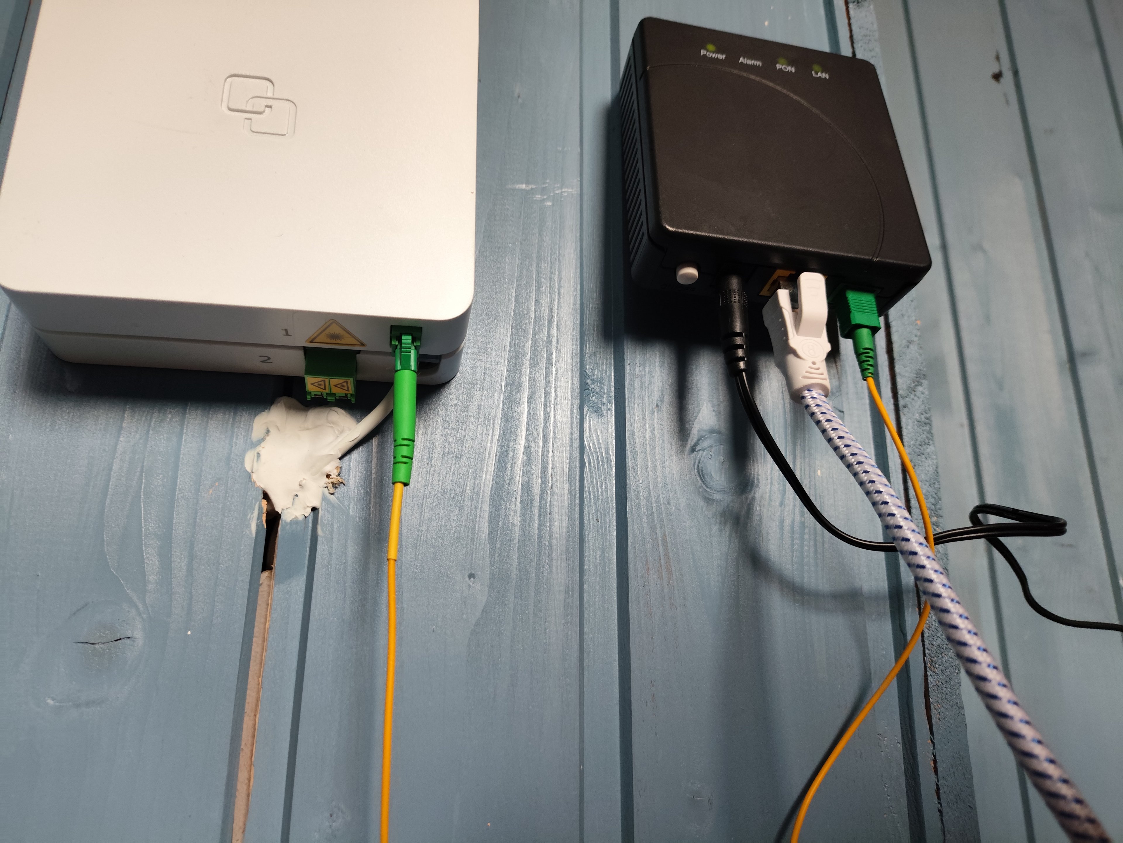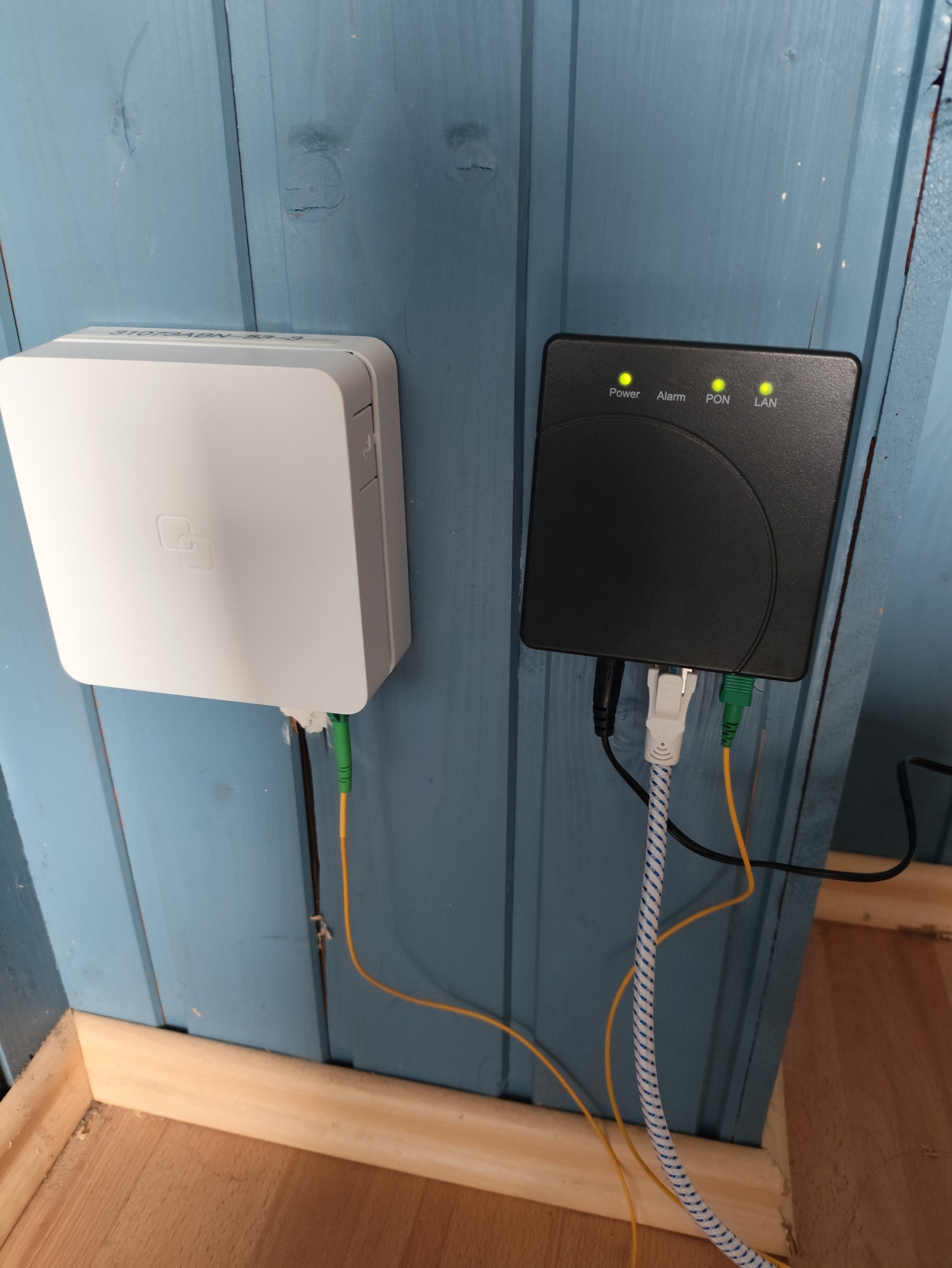 An der Schwarzen Box leuchtet die Power, PON und LAN LED Grün also müsste doch eine Verbindung zum Verteiler vorliegen?