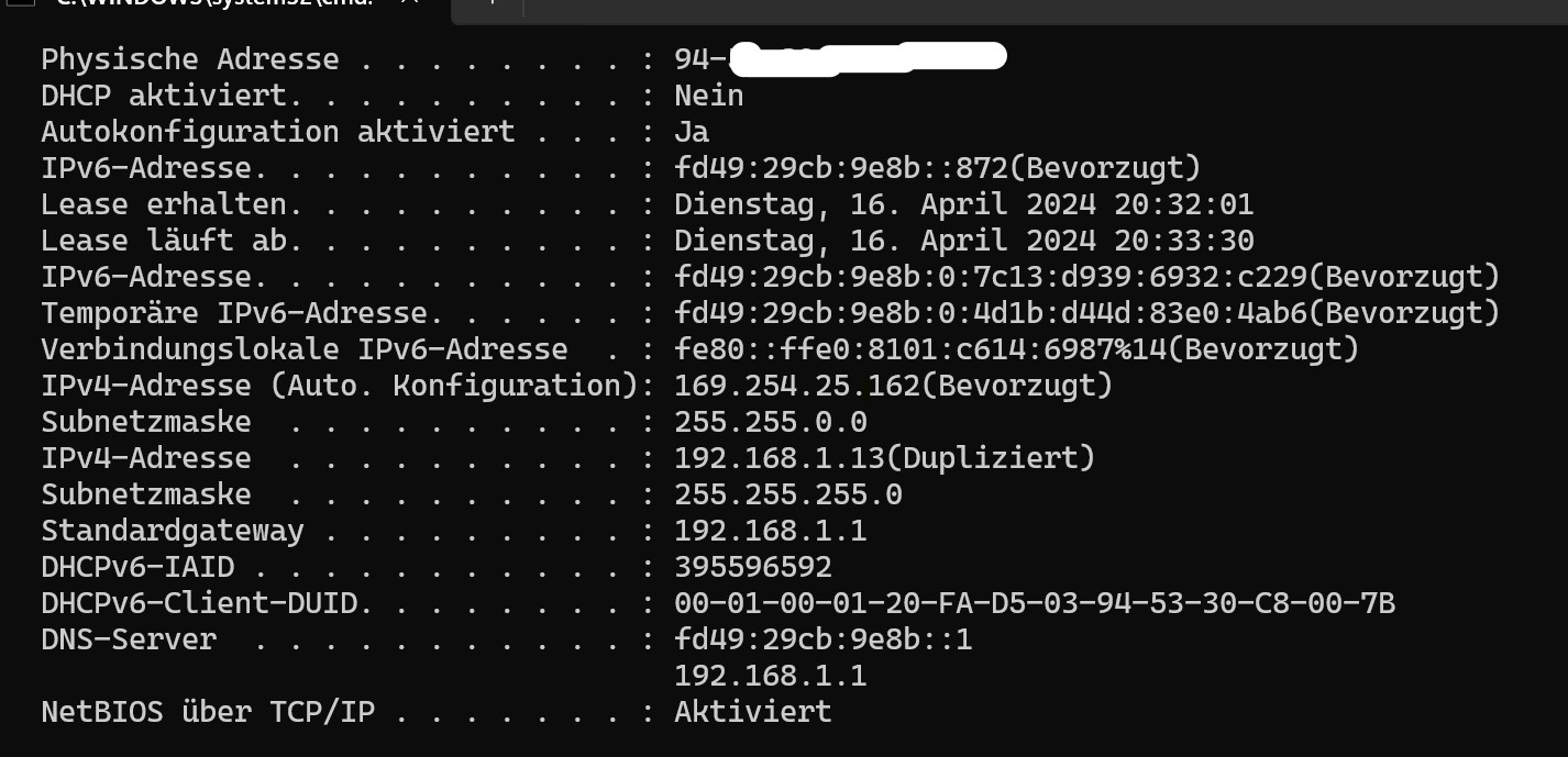Ich habe dann mal beim Laptop eine Manuelle IP eingestellt (192.168.1.13) trotzdem bleibt der Laptop (bevorzugt) auf der 169.254.25.162 Adresse (s. Screenshot2)