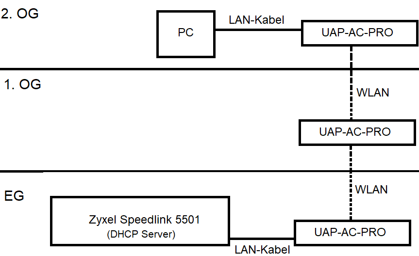 Die uap ac pros sind vom EG ins 1. OG nicht mit LAN verbunden sondern per wlan. Genau so vom 1.OG ins 2.OG. Wohnzimmer und Schlafzimmer werden in Zyxel wie oben zu sehen als LAN Verbindung angezeigt. Allerdings wird da auch ein iPad als LAN Verbindung angezeigt