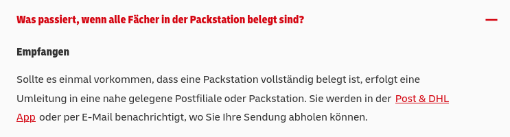 Falls eine Packstation voll ist, wandert das Paket dann immer am selben Tag in eine andere Packstation oder Postfiliale zum Abholen? Oder kann es auch passieren, dass das erst am nächsten Werktag irgendwo abholbar sein wird?