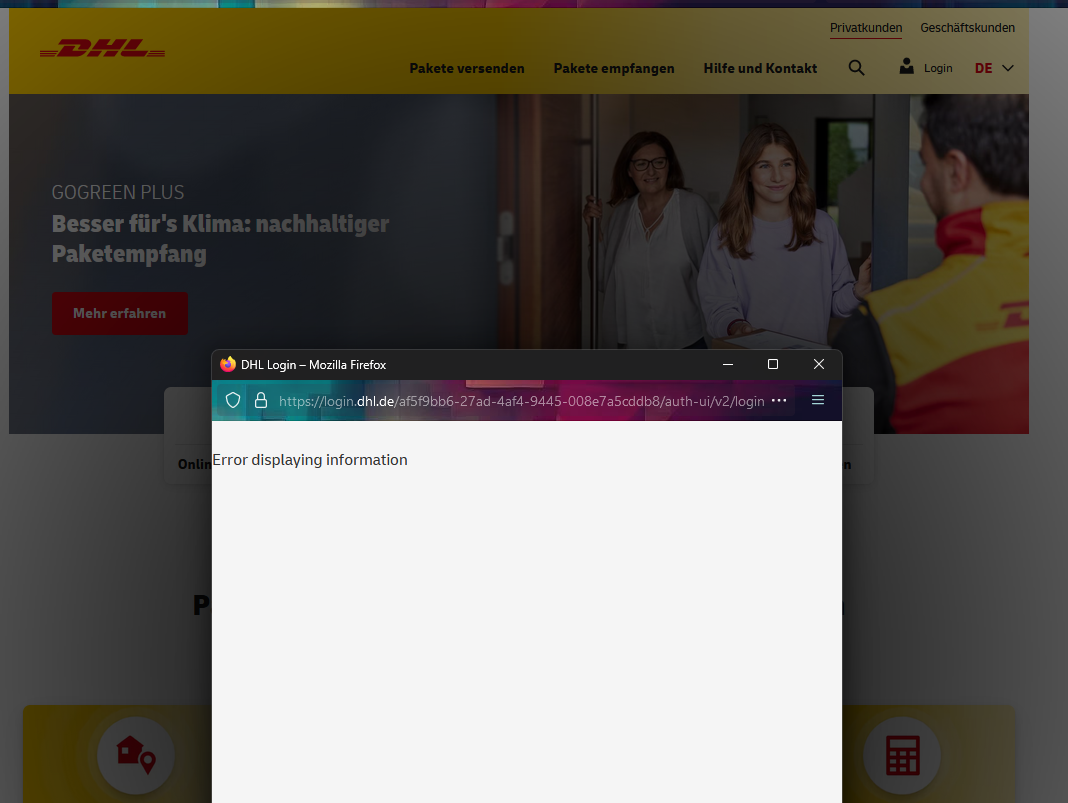 - Ich muss die Cookies von dhl.de löschen, dann logge ich mich ein und alles funktioniert.