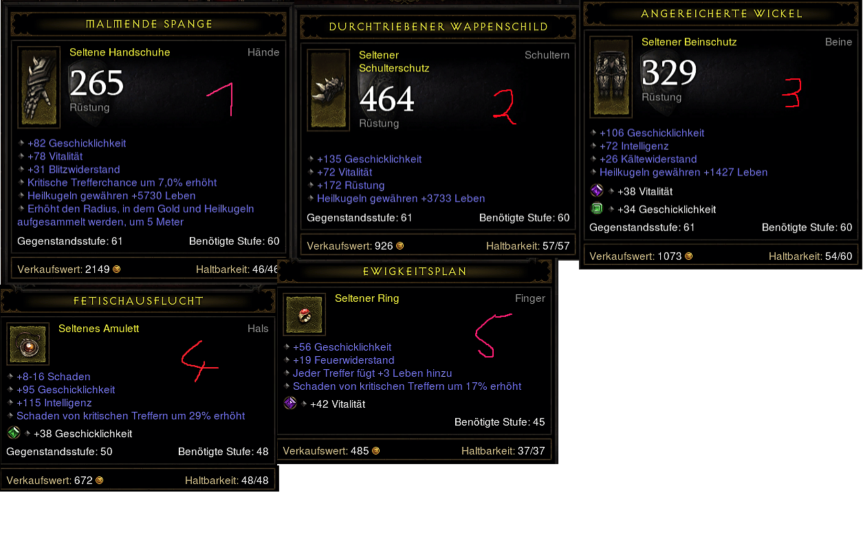 bis auf die handschuhe und die 800+ dps waffe is der rest eigentlich nur zum zerstören/händlerverkauf geeignet. das set item könnte noch billig rausgehn, aber es gibt weit aus bessere günstigere rare helme