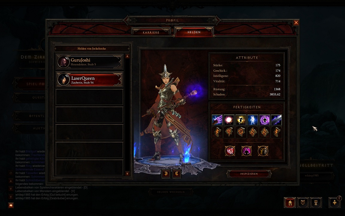 Aktuell stell ich meine Level 54 Zauberin in Akt 1 Hölle auf die Probe. Sasan hat diverse Chars angefangen, aber keinen richtig hochgezogen. Ich werde ihn morgen im Vorfeld vielleicht noch mal auf Vordermann bringen, was seinen Charakter angeht.