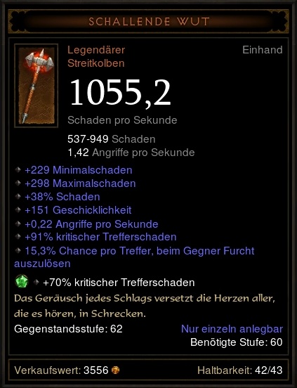 Top dps, Sockel, max aps und max LL. Da nimmt man die 19% Furcht in Kauf. Such doch mal nach ner Wut mit LL > 2,6, dex und Sockel, da findest Du aber 100%ig was im AH. Und bei hohen dps mindestens hohe 3stellige Millionenhöhe