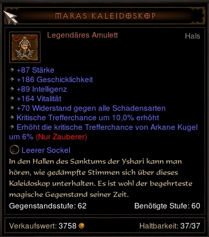 Kann mir jemand einen vernünftigen Anhaltspunkt für dieses Amulett geben? Leider kein Main Stat und dazu noch relativ schlecht gerollte IAS/CC/CD, dafür aber ordentlich LoH - wenn letzteres nicht wäre hätte ich es für einen tiefen sechsstelligen Goldbetrag eingestellt.