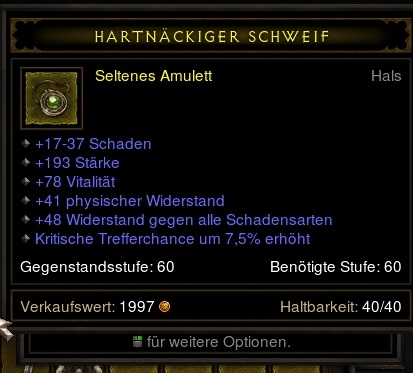 Nein keine 30 versuch mal 10 für 8-9 müsste man es loswerden.fireblade_xx schrieb:Gerade ist ein Amu gedroppt welches ich nur mittelmäßig fand, geht aber im AH ab 30 Mio los... Was ist reell? Ungern würde ich es unter wert abgeben da mein Budget sich aktuell auf 2 Mio erstreckt
