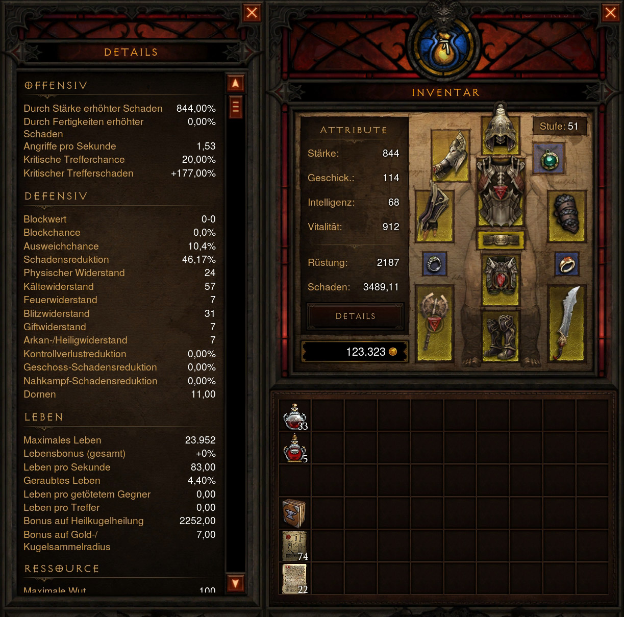 Ausrüstungsfokus lag auf Stärke und Vitalität, wie auch an den Stats zu erkennen ist.