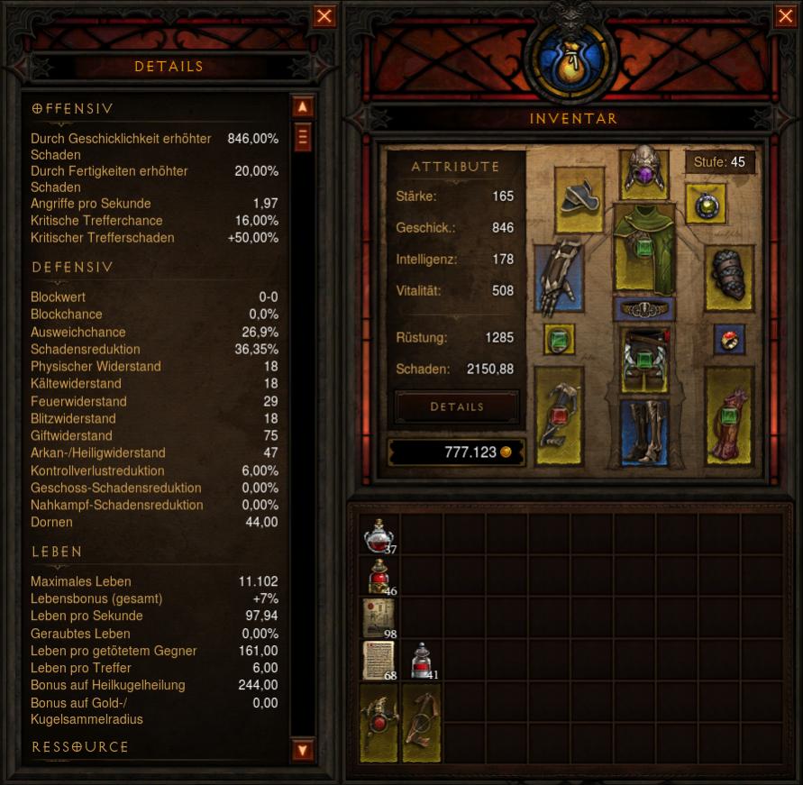 Meine Items sind eigentlich fast nur auf Kraft+Vit ausgelegt, habe etwa 60K Leben, 8K Rüstung und etwa 13K damage.
