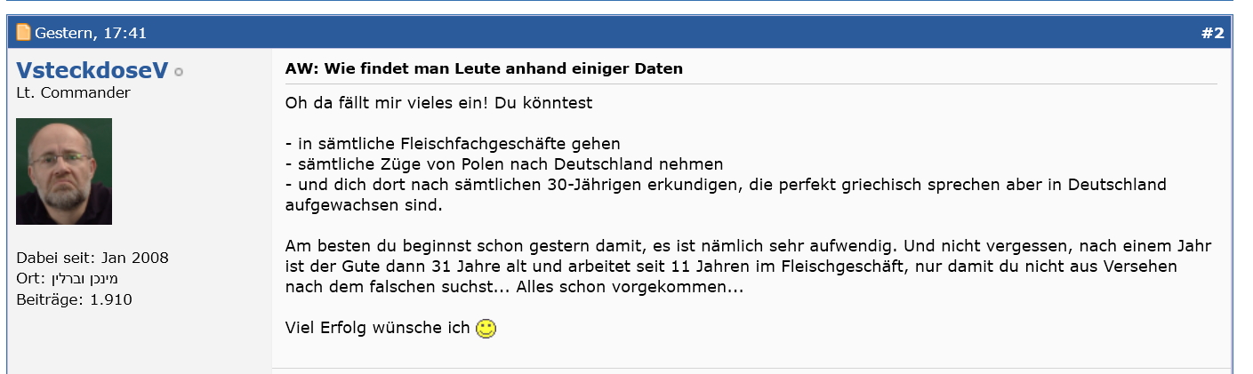 Bevor ich hier sieben Posts einzeln abfotographiere, ist hier mal einfach der Link zu dem erheiternden Thread: