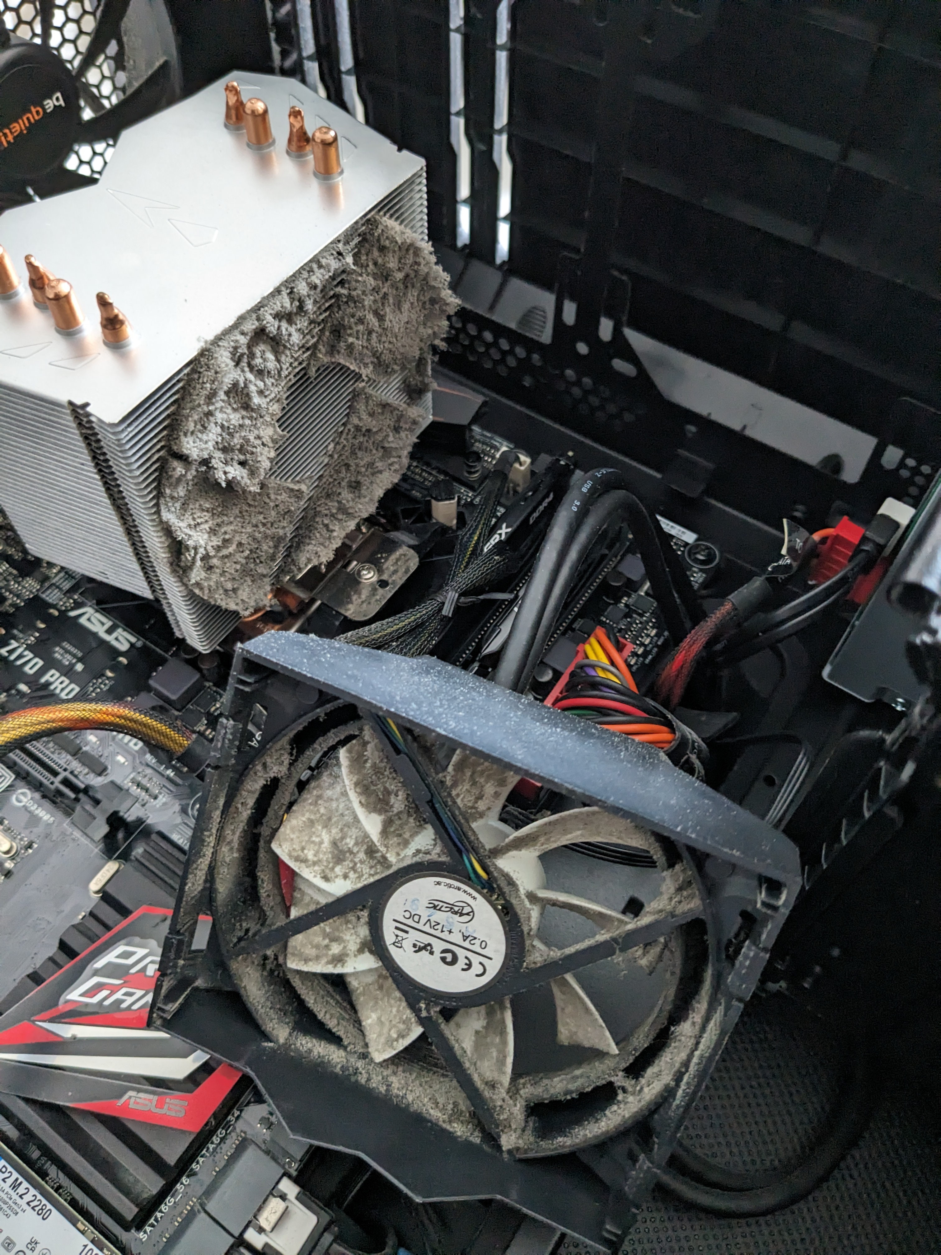 Wie viele Lüfter müssen sich in einem PC befinden? Deine Antwort: "Ja!" Das Problem dabei ist doch aber: es wird Unmengen an Geld in überteuerte Noctua-Hardware gesteckt, nur um das vollkommen Airflow-unoptimierte Gehäuse auf Biegen und Brechen leise betreiben zu können, was dann ja nicht funktioniert, denn: zehn Lüfter, ich wiederhole: ZEHN! also, Gehäuselüfter... da wäre dann ja noch der Doppeltower mit zwei weiteren Lüftern, die Grafikkarte, die ebenfalls nochmal drei (kleine 100mm) Lüfter besitzt und obendrein noch das Netzteil mit dem nicht vorhandenen Semipassivbetrieb.