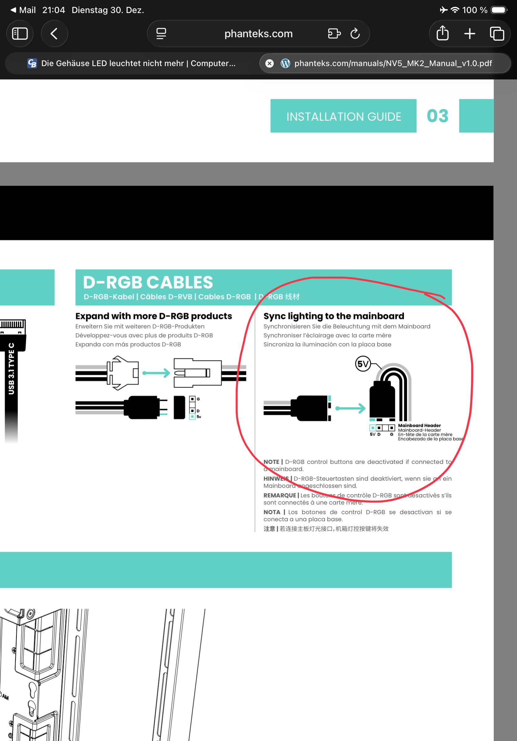Das Handbuch ist nicht besonders hilfreich, das Video leider auch nicht besonders. Ich weiß immer noch nicht, ob ich das vom Gehäusehub kommende RGB Kabel irgendwo zwischen stecken muss, damit die LED Leiste klappt.