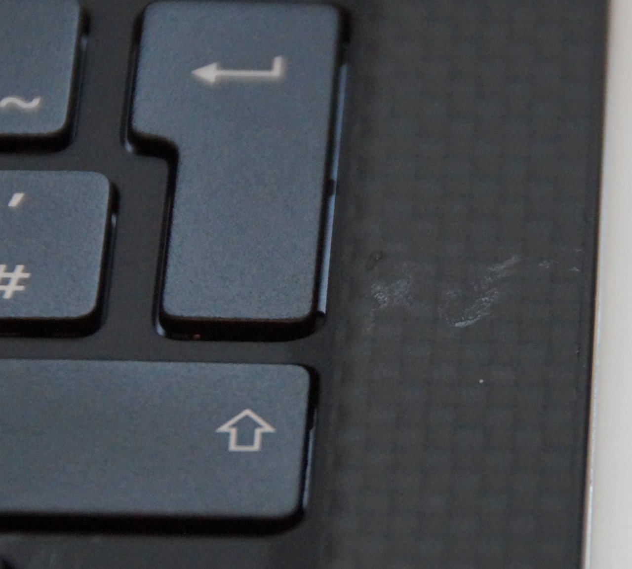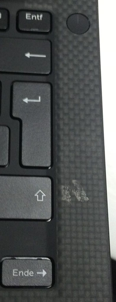 Auf dem ersten Bild ist die Oberfläche neben der Shift-Taste sichtbar beschädigt.