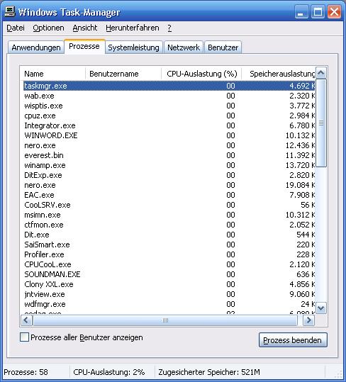 >jetzt sollten hier noch die programme stehen, die durch dich gestartet wurden, oder durch zusätzliche autostarts einiger progs. die programme die du wirklich nicht brauchst, kannst du jetzt wegclicken.