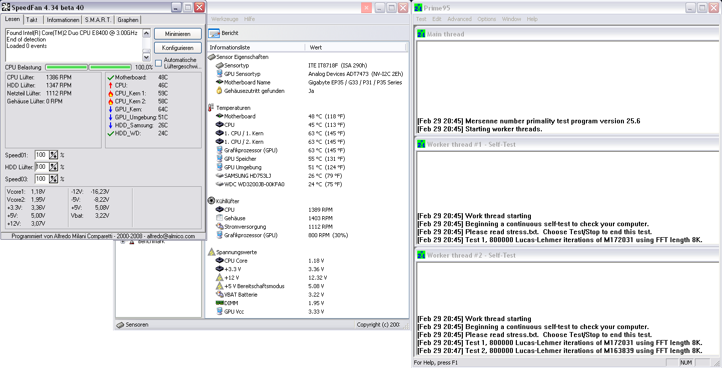 An der Front, so wie auf dem Kühler (Xigmatek HDT-S1283) befinden sich je ein Noctua NF-P12. Am Heck ist ein Silverstone 12cm Lüfter angebracht, der via Molex-Stecker angeschlossen ist. Insgesamt macht mir der PC noch zu viel Geräusche. Lieder kann ich im Moment meine Lüfter nicht so regeln, wie ich möchte (mehr dazu hier).