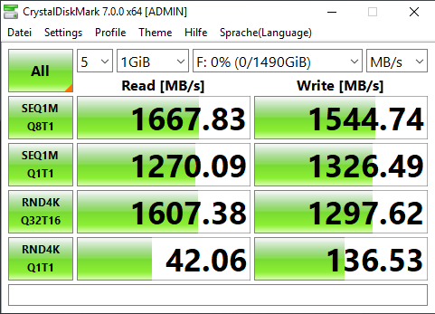 Ich weiß, dass die Performance dieser Enterprise-SSD in der derzeitigen Systemumgebung (PCIe 2.0 im x4-Mode) nicht zufriedenstellend ist. Aber ich hatte das Ding herumliegen, ich benötigte (Flash)Speicherplatz und allemal schneller als die über SATA angebundene Samsung 860 EVO ist sie ohnehin. Und ich denke, sie mich ja auch ins nächste System begleiten.