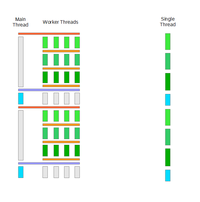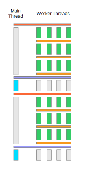 Zunächst sendet der Hauptthread ein Start-Signal an die Worker-Threads, dass sie loslegen können (dunkel orange). Die Worker-Threads beginnen dann mit der Verarbeitung (grüne Abschnitte) und synchronisieren sich dabei zwischendurch immer wieder (hell orange). Der Hauptthread wartet solange (grauer Abschnitt). Wenn die Worker-Threads mit einem Durchlauf fertig sind, senden sie ein Ready-Signal an den Hauptthread (lila), der daraufhin die Rechenergebnisse grafisch ausgibt (türkiser Abschnitt), während die Worker-Thread warten (graue Abschnitte). Anschließend sendet er für den nächsten Durchlauf wieder das Signal an die Worker-Threads, usw.