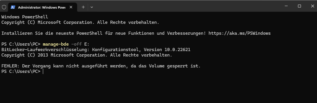 Das würde man aber in der Ausgabe vonPiak schrieb:Oder das Laufwerk kommt aus nem Firmenpc und war bewusst verschlüsselt. Bei uns Standard und den Bitlocker Key hat ausschließlich die IT