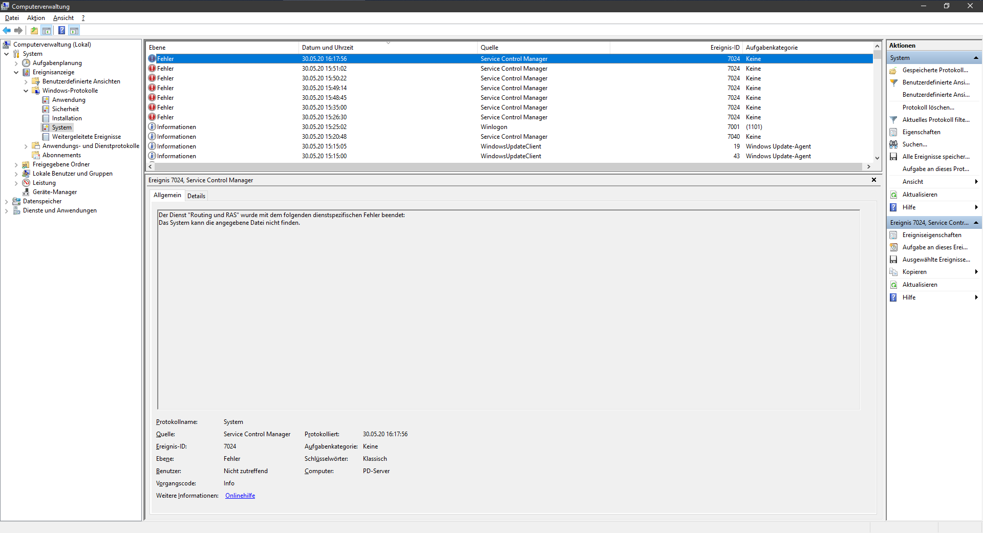 Beim Einrichten einer eingehenden Verbindungen bekomme ich die Fehlermeldung, dass der "Routing- und RAS-Dienst" nicht gestartet werden kann (Siehe Bild 1). Ein Blick in die Ereignisanzeige behauptet, dass "Das System kann die angegebene Datei nicht finden." (Siehe Bild 2).