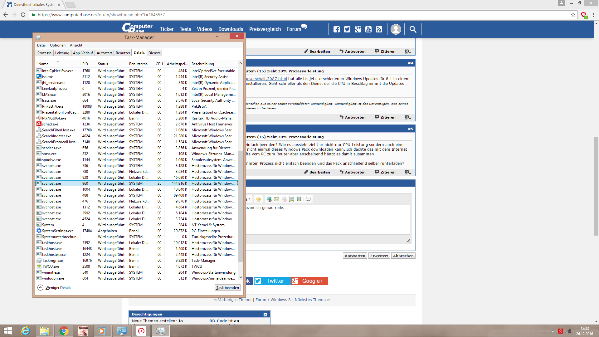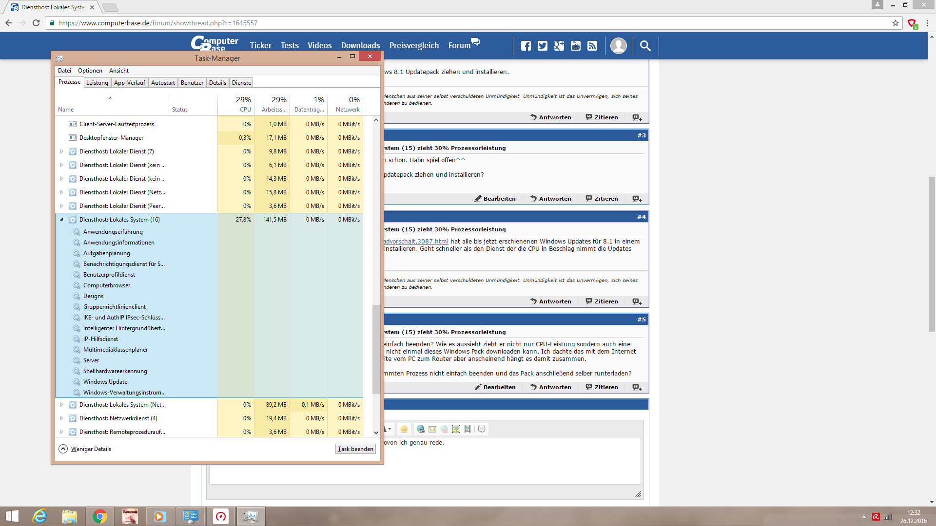 habe soeben mal im Task-Manager geschaut wie viel Leistung meine aktuellen Programme ziehen. Die Zahl hat mich wirklich gewundert. es waren 70%. Dann habe ich mal geschaut was genau da so viel Leistung frisst und siehe da: ein Systemprozess zieht 30% Leistung. Er Heißt "Diensthost Lokales System (15)".