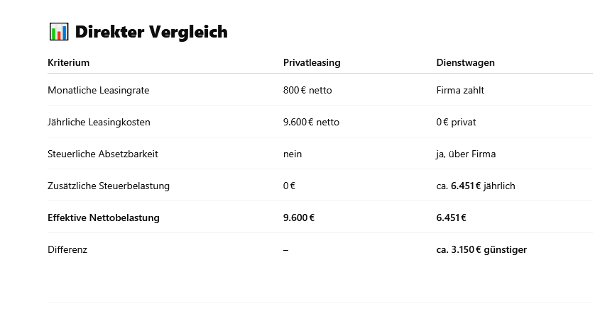 Dein Chat GPT Protokoll ist zwar nett und die Rechnung geht so klar, dies aber ist kein Beweis dafür, dass teure Autos nicht gekauft wären, wenn es keine Firmenwagen wären. Dies ist pure Wahrscheinlichkeitsrechnung. Genauso die Diskussion ob mit einem Firmenwagen privat ein PKW eingespart wird, wäre oder würde.